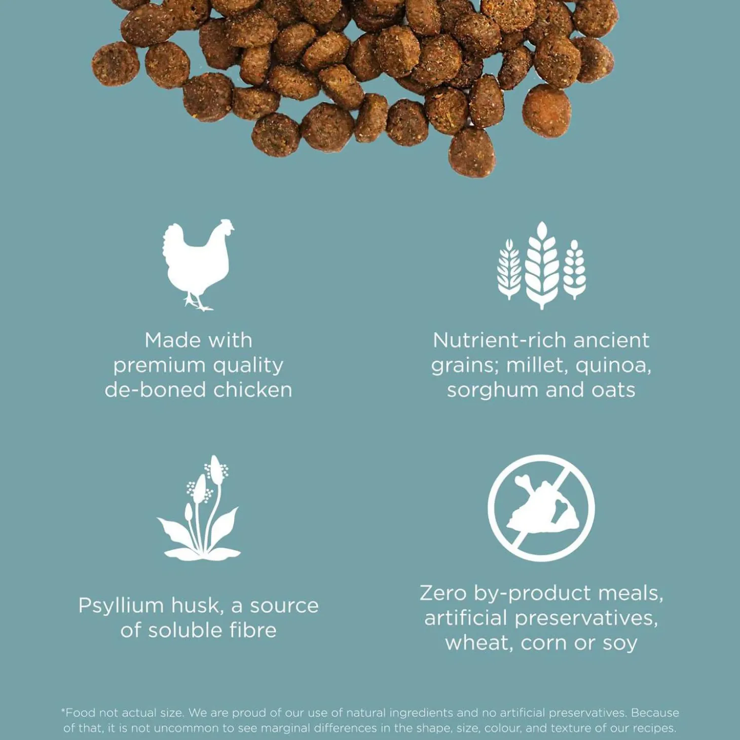 - Formulated with delicious cage-free chicken for protein, and fibre-rich ancient grains like whole oats, millet and quinoa for digestion support