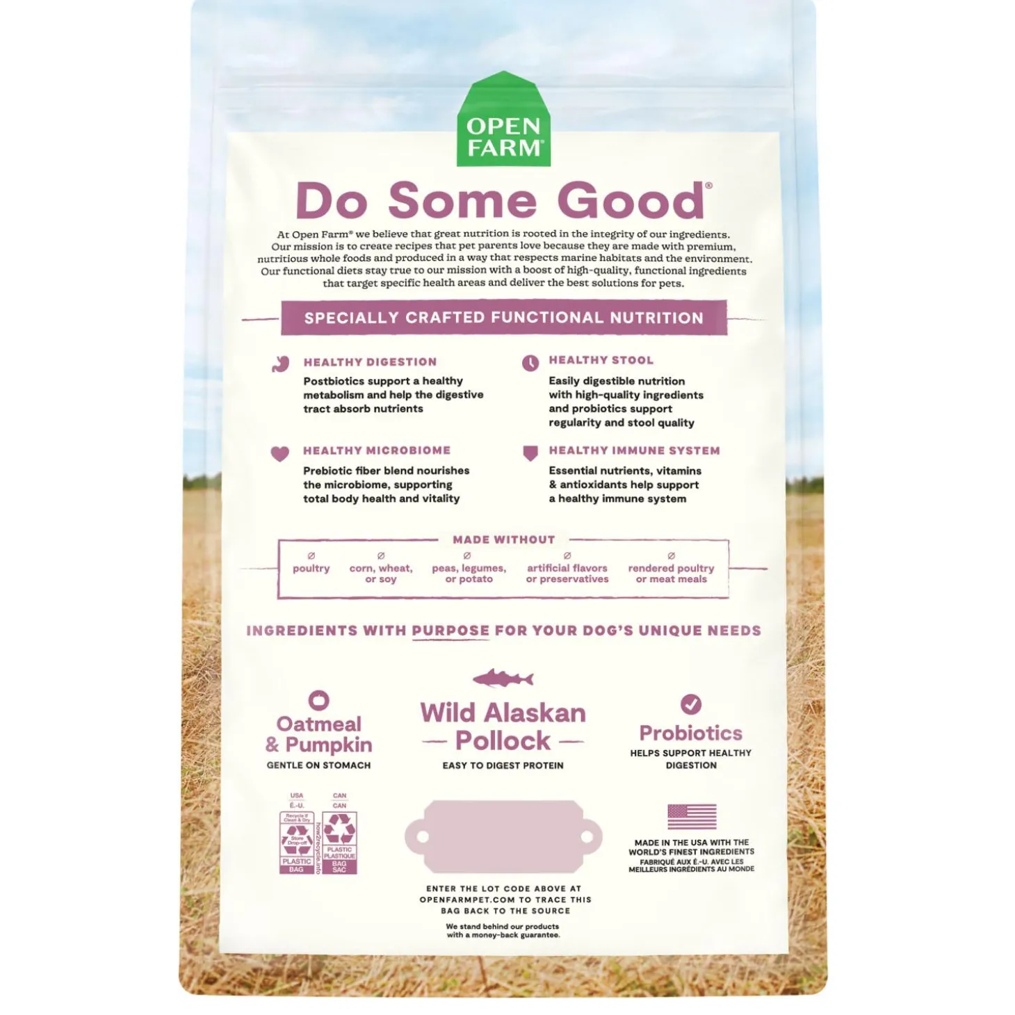 Open Farm Digestive Health Wild Alaskan Pollock & Oatmeal Recipe Adult Dog Food provides an easily digestible recipe that is gentle on the stomach. This veterinarian formulated recipe is made with nutrient rich and easily digestible Ocean Wise recommended wild Alaskan pollock as the 1st ingredient, combined with stomach soothing fibers like oatmeal and pumpkin. This recipe is packed with prebiotics, probiotics, and postbiotics to support a healthy gut and maintain stool quality. Open Farm’s functional diets stay true to the mission with high-quality, functioning ingredients that target specific nutritional needs and deliver the best solutions for pets.
