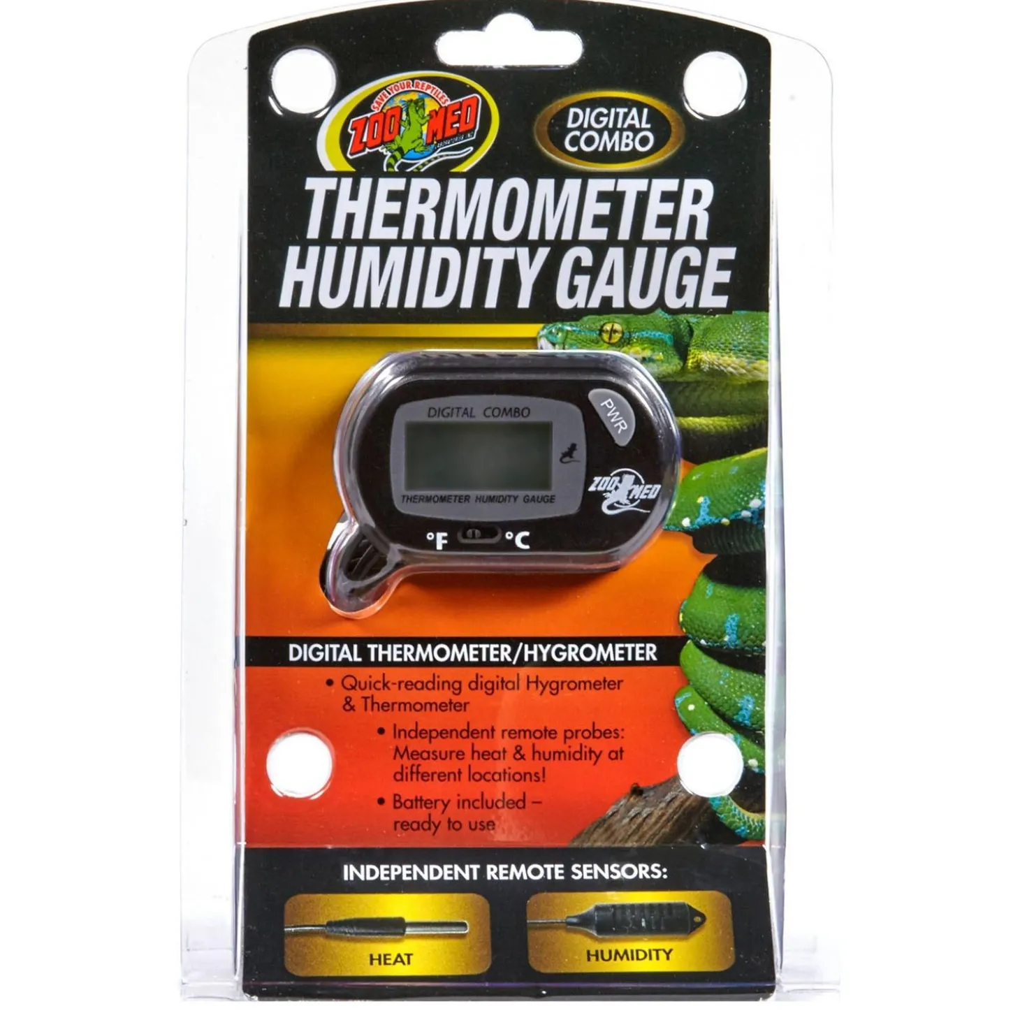 Zoo Med Digital Thermometer & Humidity Gauge is perfect for terrariums, incubators, or other pet animal applications. It has independent remote probes that measure heat and humidity at different locations. It also has a waterproof temperature probe that can be used in air or submerged in water.