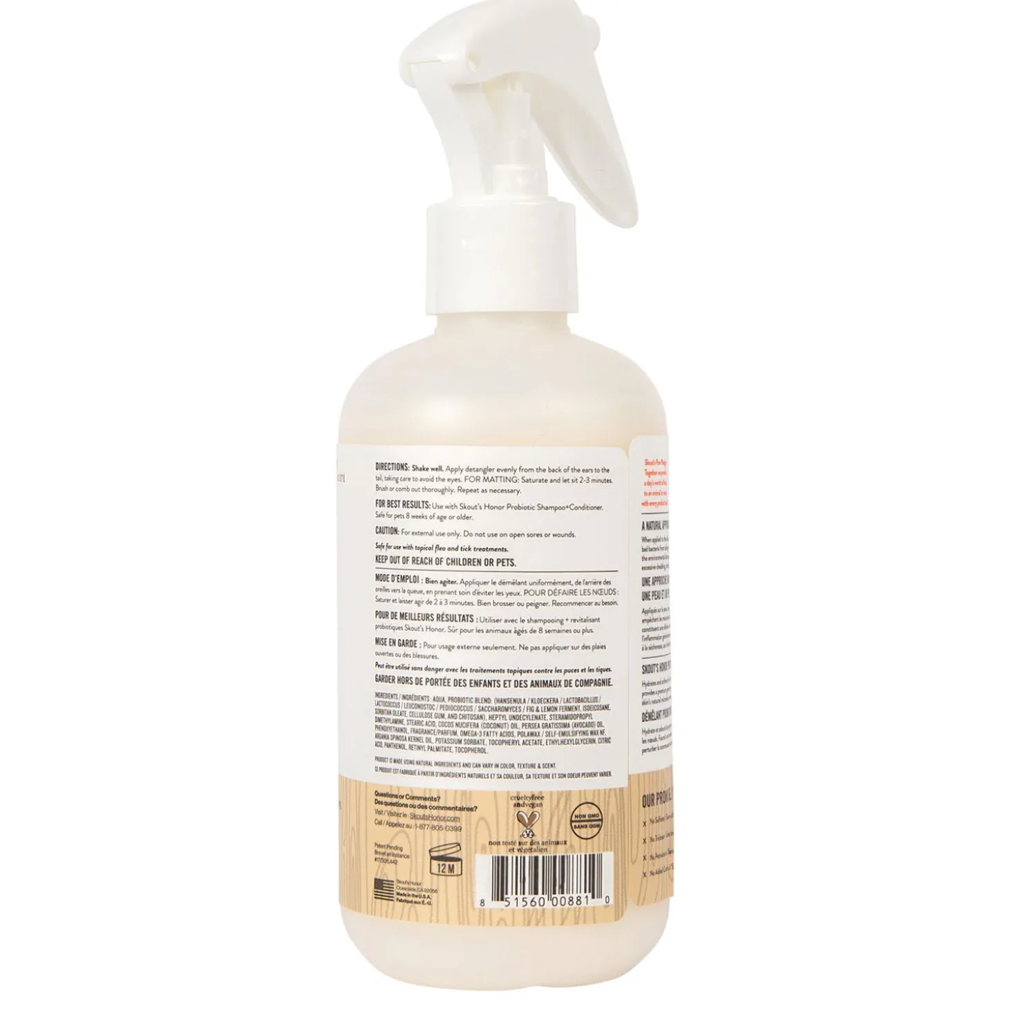 Skout’s Honor Dog of the Woods Probiotic Detangler Spray is both a dog and cat hair detangler that hydrates the skin and softens the coat for a more brushable, tangle-free pet. It contains avocado oil and live, topical probiotics that help support a healthy microbiome to defend against common skin problems such as itching, odour, dryness, dandruff, hot spots, and excessive shedding. It is great for pets that need detangling, hydration, odour-control and itch relief. Also provides an added boost of probiotics in between bathing for pets that suffer from skin irritations due to environmental allergies. It is infused with a live, colony-forming probiotic kefir culture to bring out your pet’s natural beauty. Suitable for all skin types and conditions. This detangler leaves a lasting scent of musk.