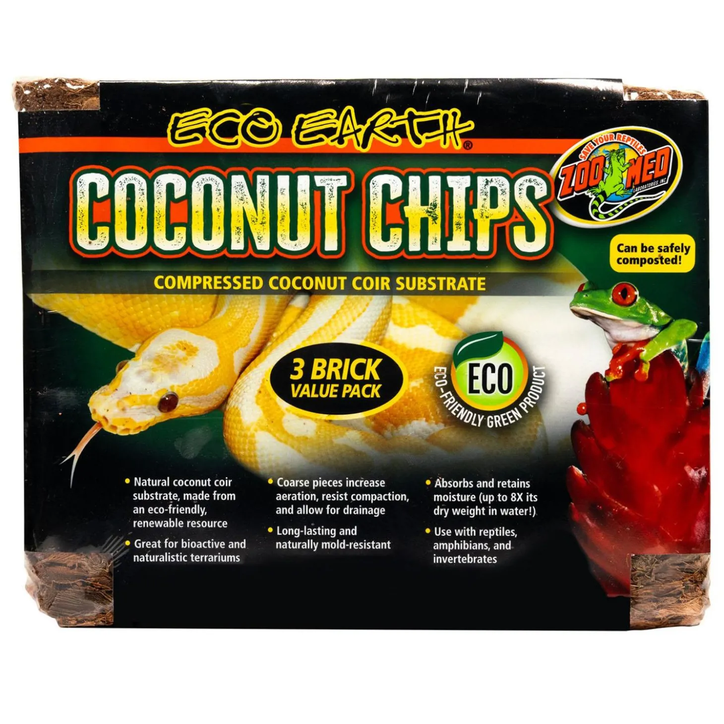 Zoo Med Eco Earth Coconut Chips is a natural coconut coir substrate made from an eco-friendly, renewable resource. The material is highly absorbent (holds up to 8 times it’s dry weight in water!) and retains that moisture well, releasing it slowly to create a humid, tropical environment perfect for a variety of different reptiles, amphibians, and invertebrates. This substrate works well as a stand-alone substrate for humidity-loving species, and for humid microclimates, but can also be used in bioactive substrates. When mixed into a bioactive soil mixture, the coarse pieces increase aeration, resist compaction and allow for drainage which are all beneficial factors in supporting live plant growth and clean-up-crew health. Coconut Chips are long-lasting and naturally mold-resistant, so you won’t need to change or replace them frequently. After use, this product can be safely composted and re-used in potted plants or gardens.
