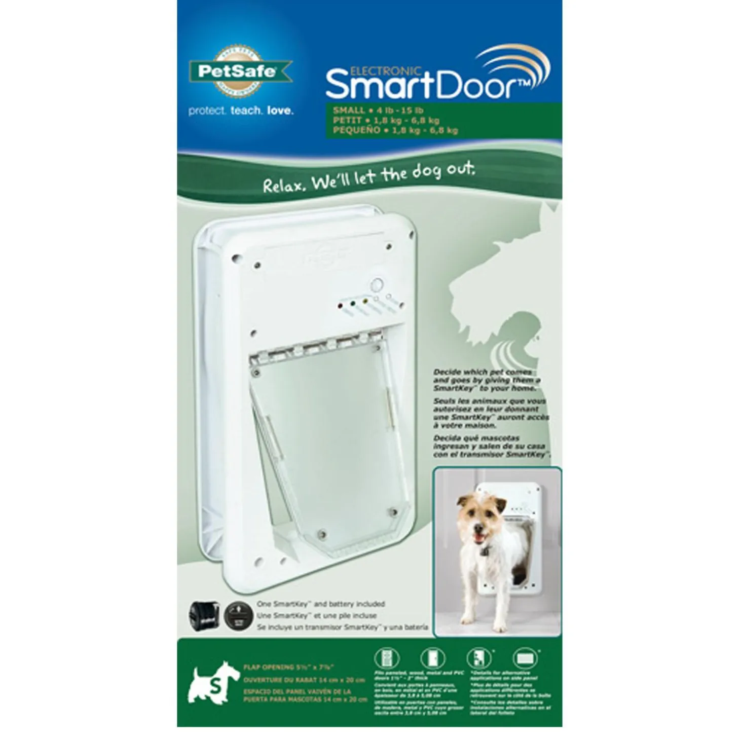 Wouldn’t it be great if you didn’t have to get up every time your dog wanted to go outside or come back in? If you have a fenced yard, that can happen when you get him a PetSafe Electronic SmartDoor Pet Door. A SmartKey on his collar will be his own special key to the house – and the yard. SmartDoor uses radio-frequency technology to read the unique signal from the SmartKey. The SmartKey triggers the battery-powered door flap to unlock when the dog approaches, and locks again when he goes out of range. This ensures that unwanted visitors like raccoons, squirrels and skunks don’t wander in.