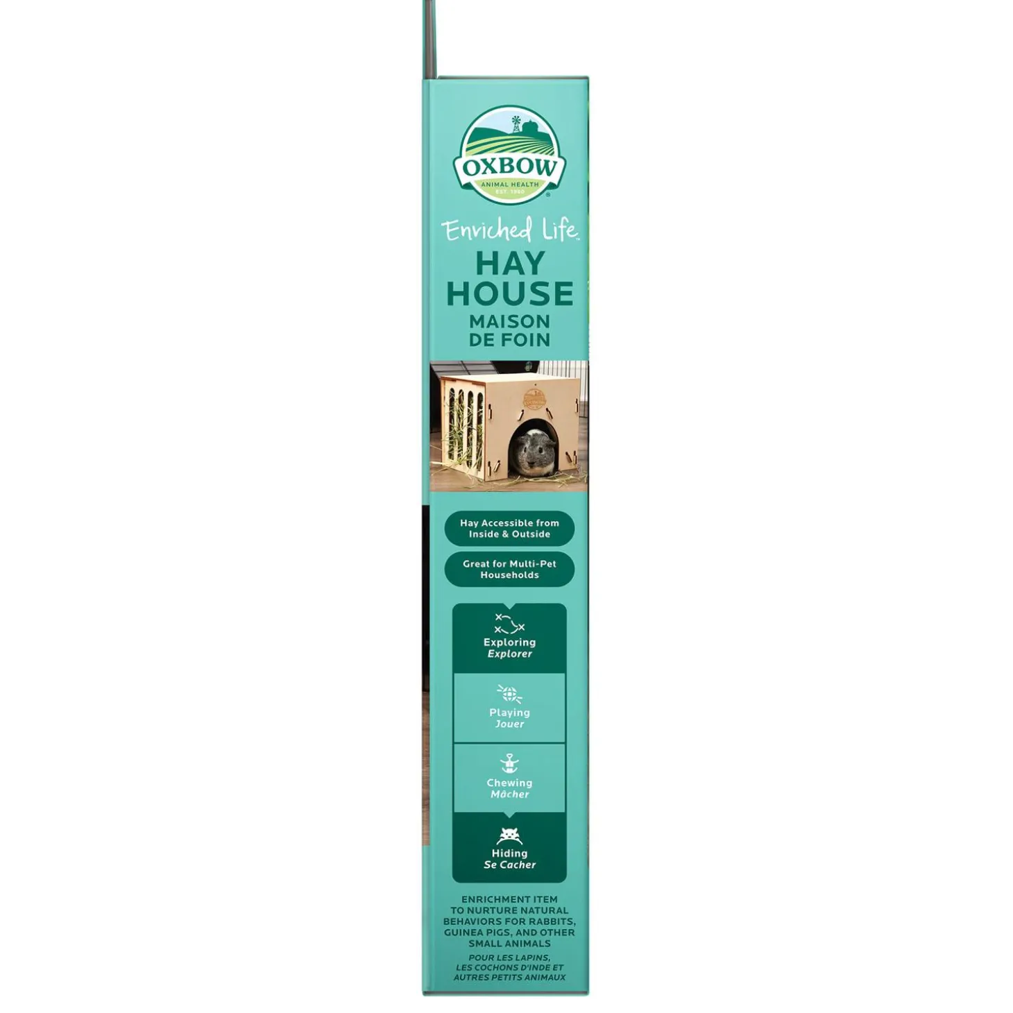 Oxbow Enriched Life Small Animal Hay House is a fun and engaging way to feed your small friend! This house, makes it easy to feed your pet with the hay being accessible from inside and out. Great for multi-pet households, it is easy to assemble and made with 100% untreated wood. Treat your pet with this edible home!