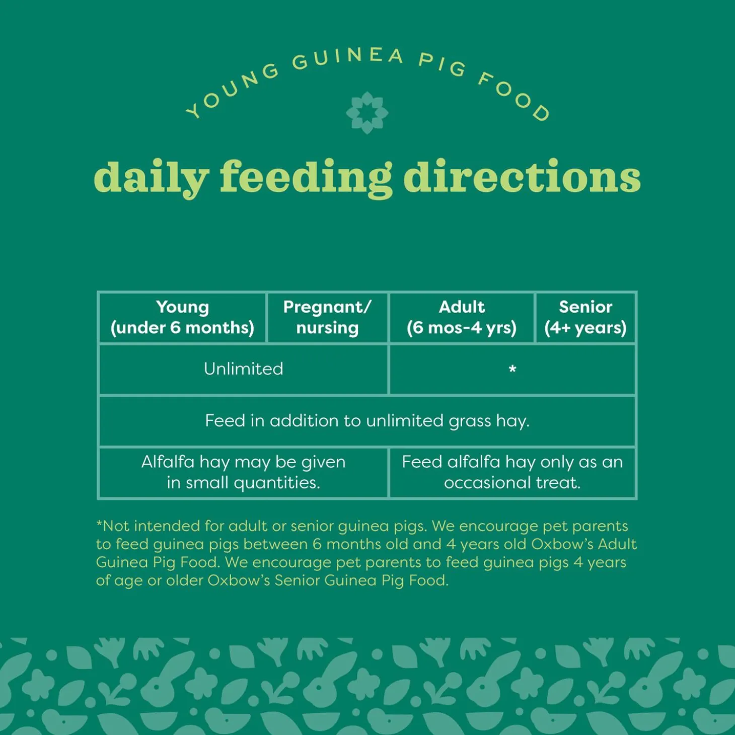 Oxbow’s Essentials Young Guinea Pig Food is formulated to meet the specific nutritional needs of young, pregnant, and nursing guinea pigs and help them thrive. This complete and balanced young guinea pig food contains Alfalfa hay to provide optimal energy and the fiber essential for healthy digestion. We then add wholesome ingredients and vital nutrients to meet the growth, energy, pregnancy, and nursing needs of guinea pigs.