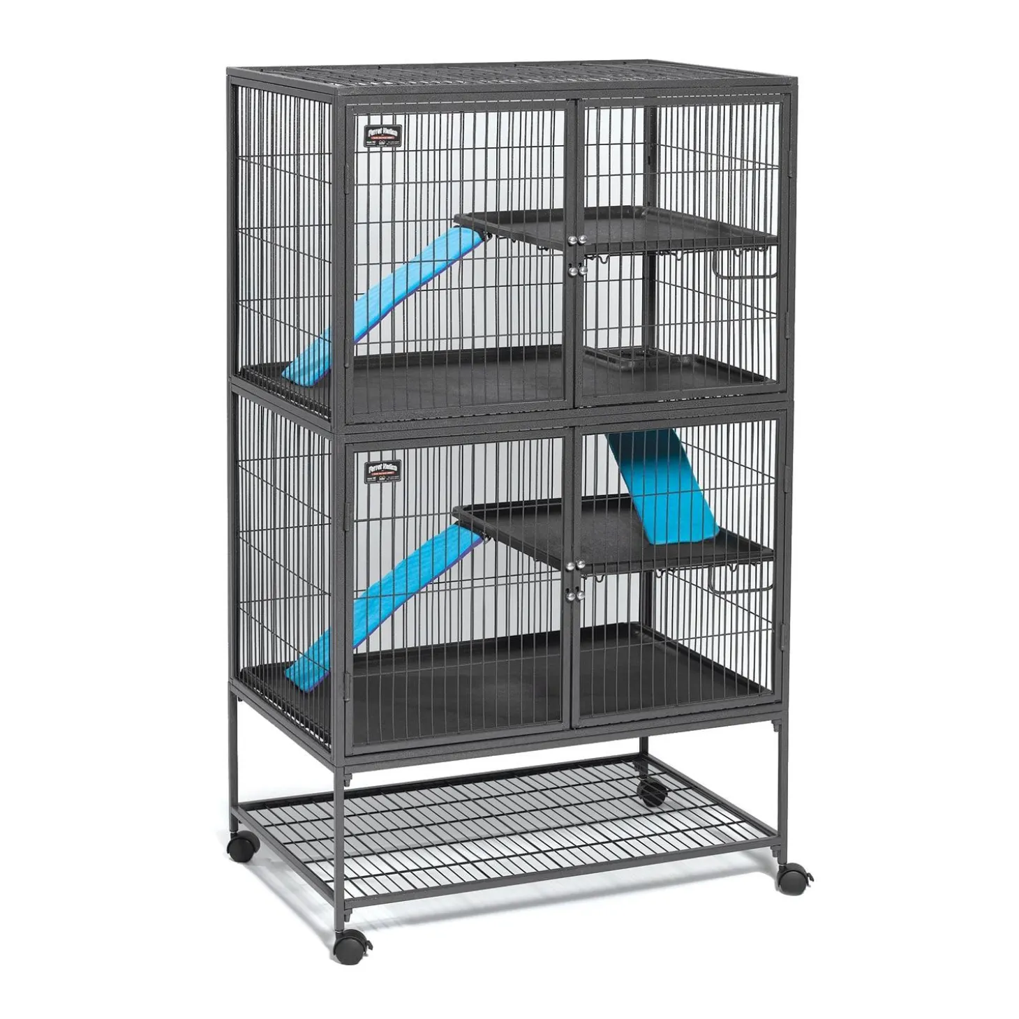 Midwest Ferret Nation- Double Unit w/Stand Ferret Cage is a home that attends to their every need to maintain a content, happy and safe lifestyle. Midwest has watched very closely how ferrets play, eat, sleep, and interact. This double unit includes interlocking panels that safely and securely lock in place without the use of any screws, nuts or bolts.