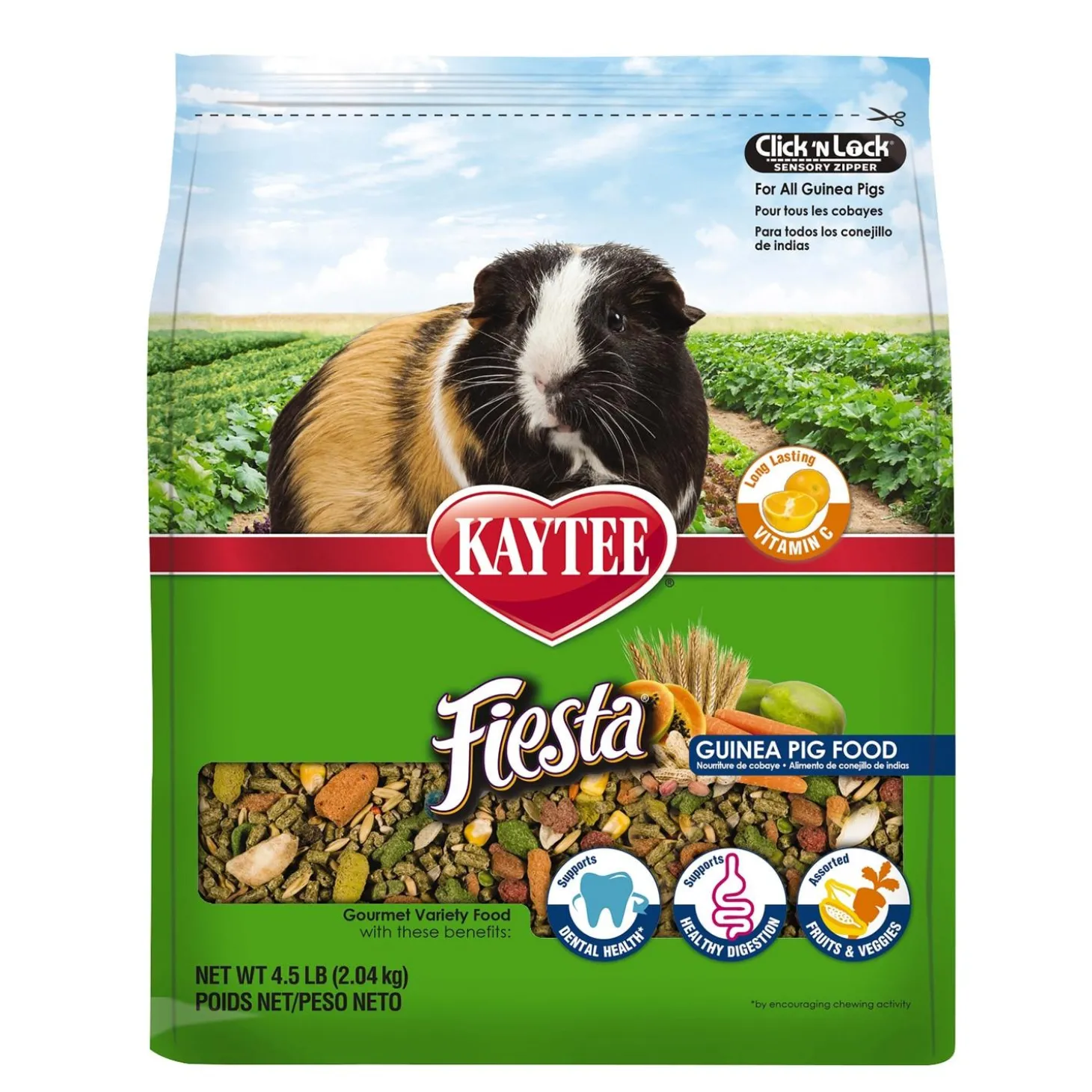 Kaytee Fiesta Guinea Pig food is a nutritionally fortified gourmet diet made of a premium blend of fruits, vegetables, seeds and grains offering maximum variety, fun and nutrition for small animals. Fiesta contains prebiotics and probiotics to support digestive health and is formulated with your small animal species in mind.