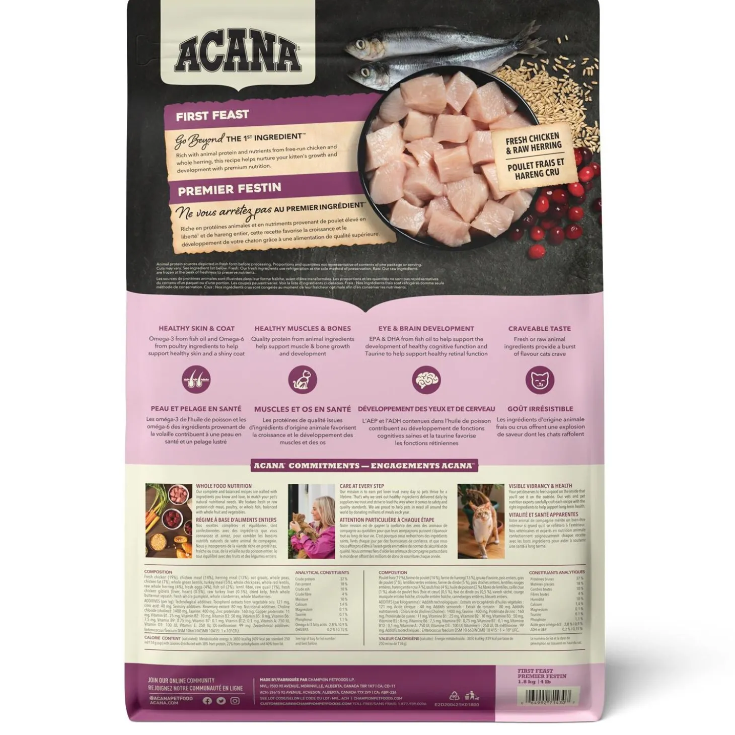 ACANA First Feast Kitten Cat Food helps support your kitten’s growth and development. Rich with 70% quality animal ingredients* including fresh or raw free-run** chicken and whole herring, First Feast has the animal protein your kitten needs to grow up strong. This nutrient-dense recipe also helps support key health benefits for your kitten, including healthy skin & coat, healthy muscles & bones, and eye & brain development. Nurture your kitten with a recipe tailored to help them grow up healthy and happy!