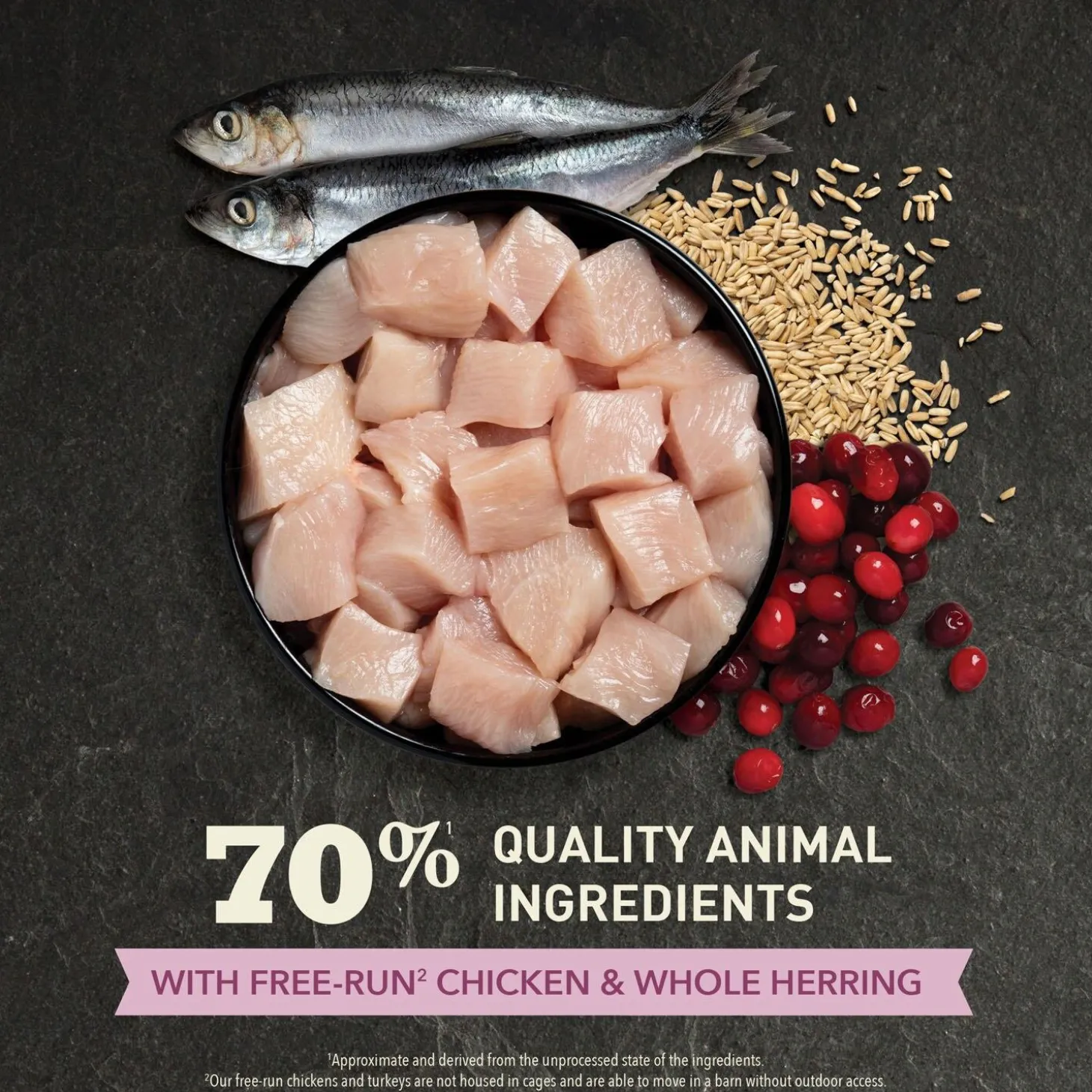 - Rich with 70% quality animal ingredients* like free-run** chicken and turkey and whole herring