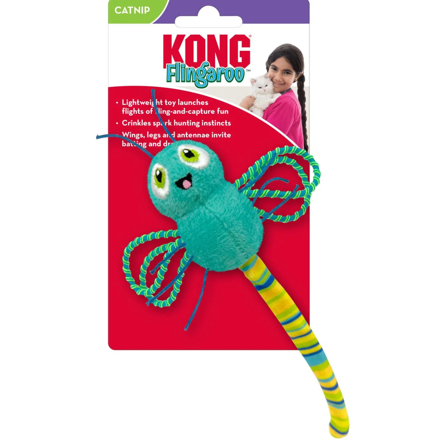 KONG Flingaroo Dragonfly Assorted Colours Cat Toy launches cats into flights of pounce-and-capture fun, with elastic wings that fuel long-distance flings for lots of healthy exercise. The long, lightweight body crinkles to spark natural hunting instincts and tempting legs and antennae invite batting and dragging. KONG Premium North American Catnip inside prolongs play.