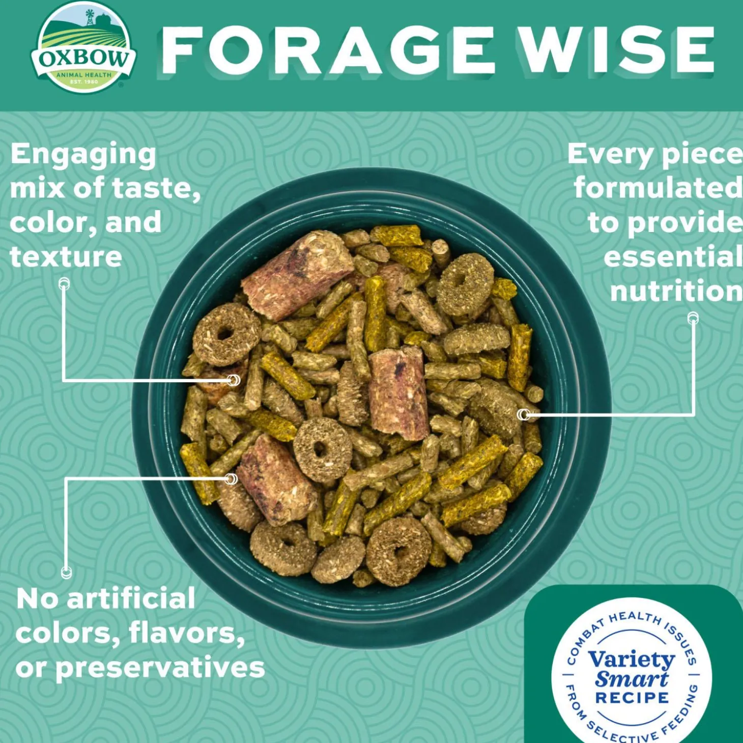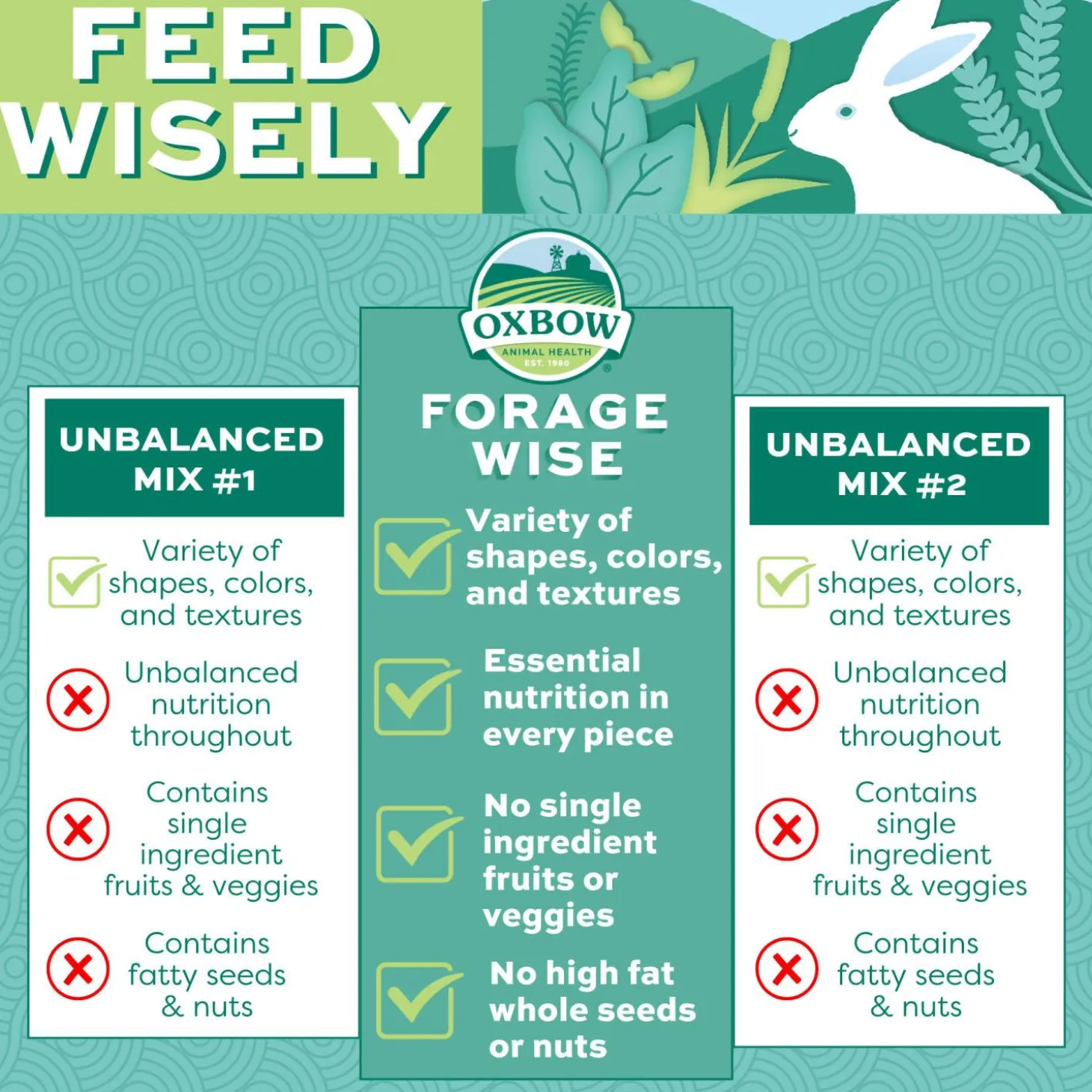 Oxbow Forage Wise Complete Adult Rabbit Food is the smart way to fill your rabbit’s bowl. With the perfect balance of enriching variety and delicious nutrition, it is made to engage your rabbit’s foraging instincts with a fun blend of shapes, colours, textures, and flavours. Unlike other mixes that can lead to selective feeding of ingredients lacking in essential nutrients, every piece of this recipe is formulated to provide essential nutrition.