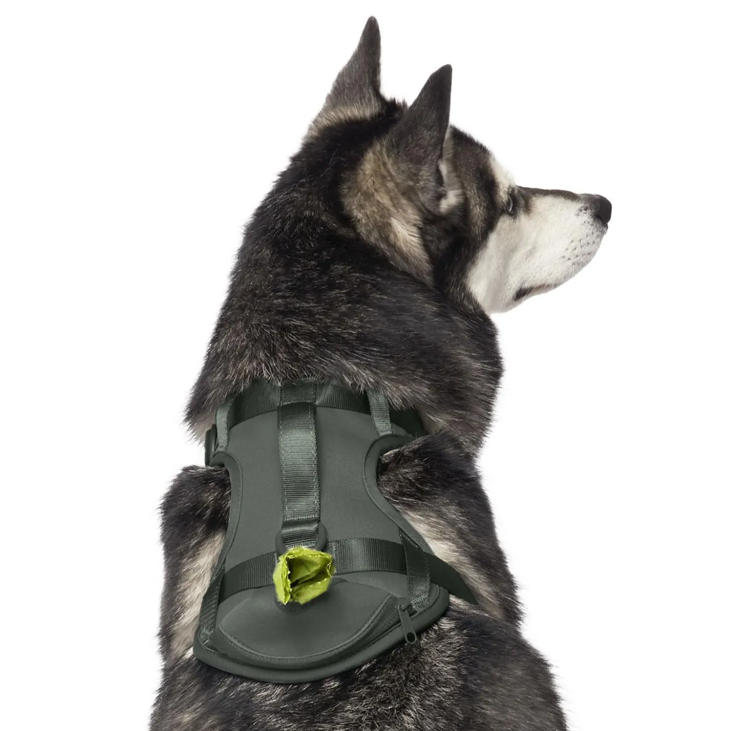 Canada Pooch Forest Green Neoprene Dog Harness has a convenient built-in poop bag dispenser! Like the Everything Harness, this no-pull dog harness allows for more control on walks. Recommended for light to moderate pullers, this harness is comfortable for everyday wear and strength & safety tested.