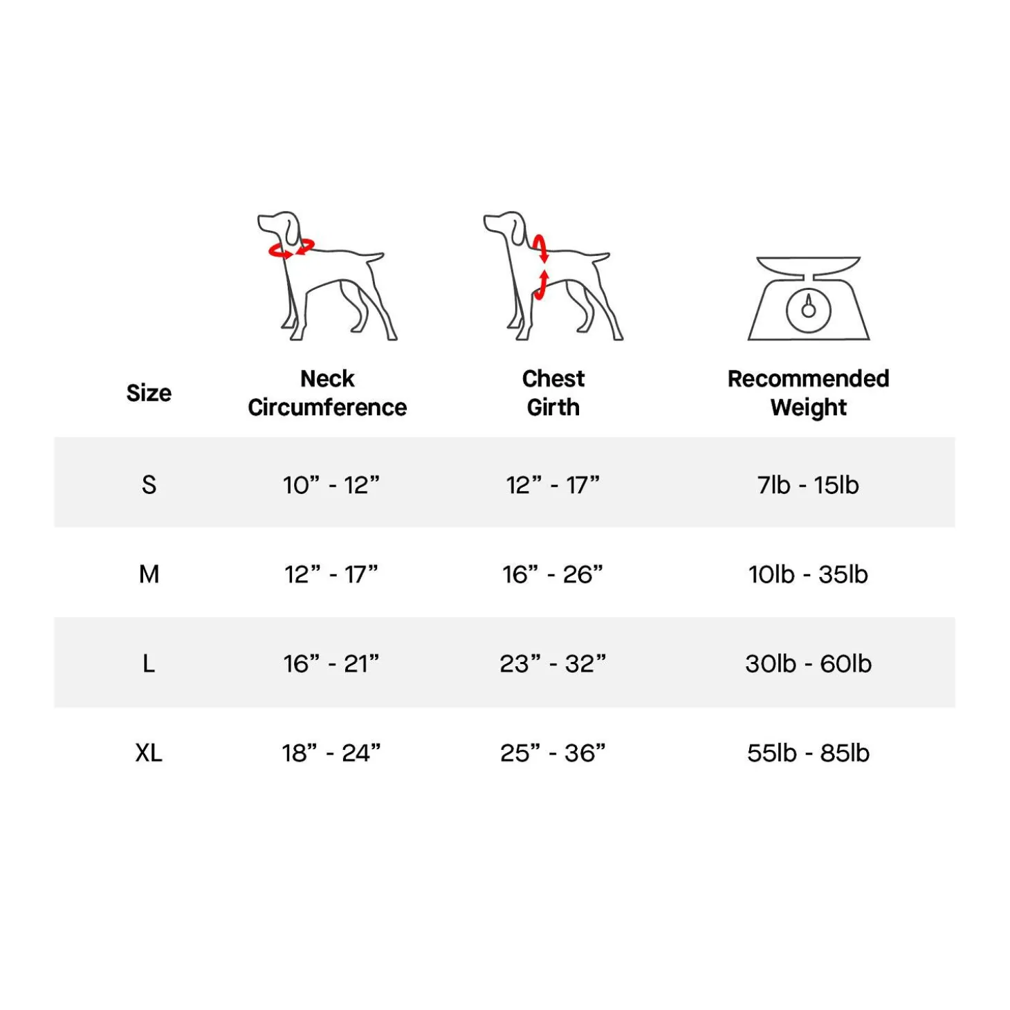 | Pet Size | Neck Circumference | Chest Girth | Recommended Pet Weight |