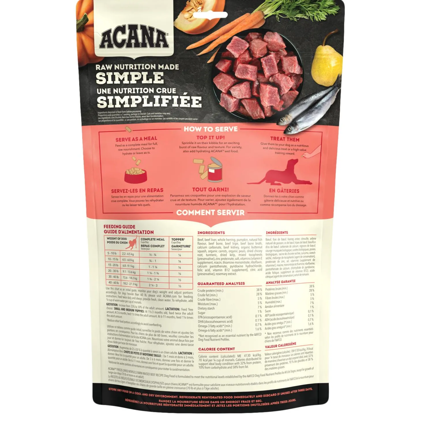 ACANA Freeze-Dried Morsels Ranch-Raised Beef Recipe Dog Food satisfies your dog’s natural cravings in a convenient, freeze-dried form. Made from 90% quality animal protein from ranch-raised beef and whole wild-caught mackerel, and infused with delicious bone broth, you can serve morsels or patties on their own or as a topper at mealtime.