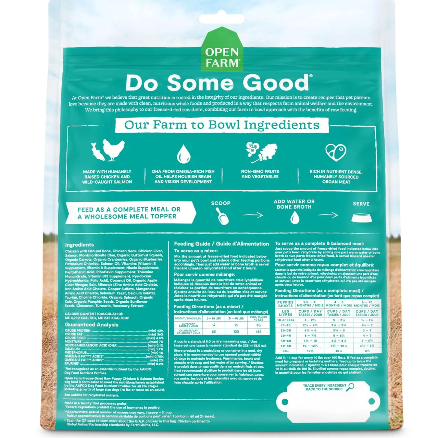 Open Farm Freeze-Dried Raw Chicken & Salmon Recipe Puppy Dog Food features G.A.P certified, humanely raised chicken and chicken organs with no antibiotics or added hormones. In addition, Ocean Wise recommended salmon and organic, non-GMO fruits and vegetables are added to provide a highly nutritious topper or complete and balanced meal your pup will crave.