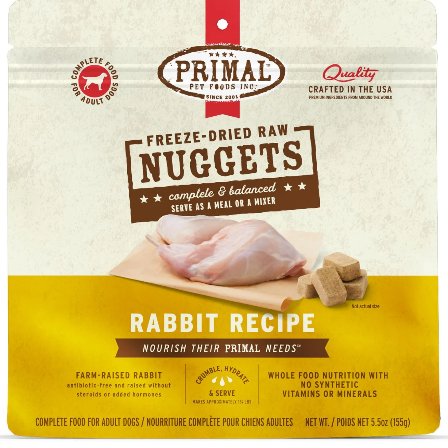 Primal Freeze-Dried Raw Nuggets Rabbit Recipe Adult Dog Food offers you the convenience and benefits of a well-balanced, safe and wholesome raw-food diet without having to grind, chop, measure or mix the ingredients yourself. Primal Pet Foods takes the time to carefully formulate and produce a nutritious, fresh-food diet that is easy for you to serve and delectable for pets to devour. The proof is watching them lick the bowl clean while thriving happily and healthfully!