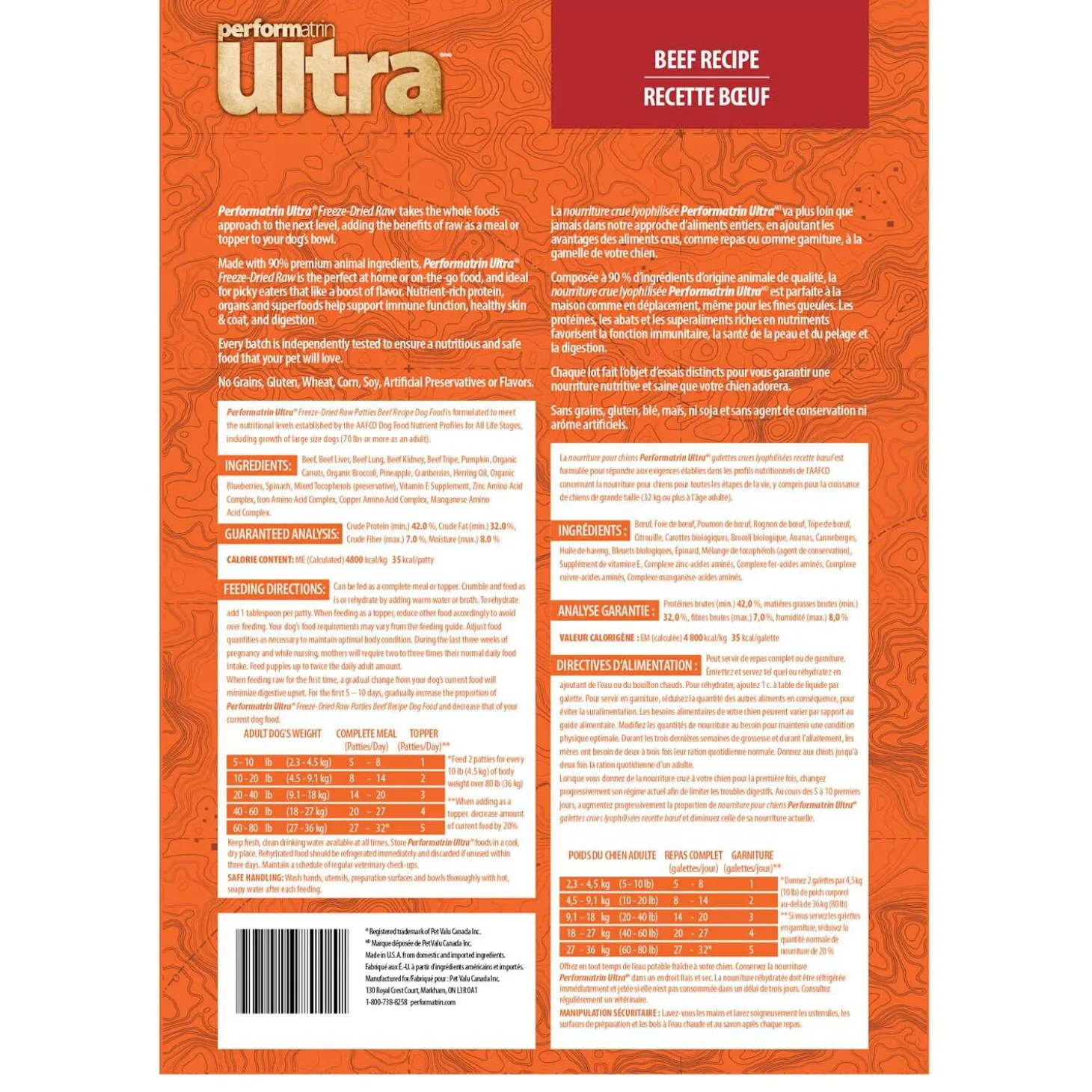 Performatrin Ultra Freeze-Dried Raw Bites Beef Recipe Dog Food is made with 90% premium animal ingredients. It offers all the benefits of a Raw Diet in a convenient dry form. It is the perfect at home or on-the-go food, and ideal for active dogs and picky eaters that like a boost of flavour. Nutrient-rich beef, organs and superfoods help support immune function, healthy skin & coat, and digestion. The Freeze-Drying process retains nutrients such as proteins, amino acids, enzymes, and antioxidants in their most natural state. Every batch is independently tested to ensure a nutritious and safe food that your pet will love.