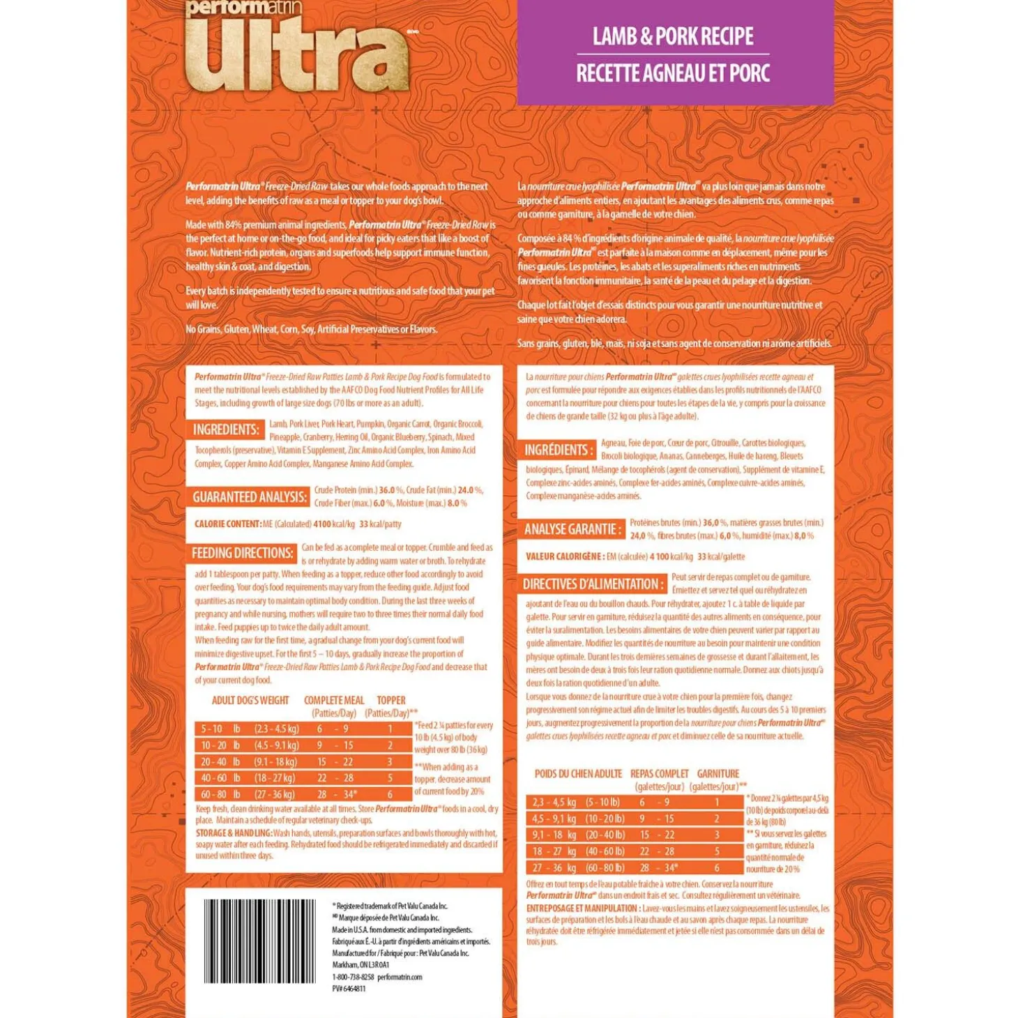 Performatrin Ultra Freeze-Dried Raw Bites Lamb & Pork Recipe Dog Food is made with 84% premium animal ingredients. It offers all the benefits of a Raw Diet in a convenient dry form. It is the perfect at home or on-the-go food, and ideal for active dogs and picky eaters that like a boost of flavour. Nutrient-rich farm raised lamb and pork, organs and superfoods help support immune function, healthy skin & coat, and digestion. The Freeze-Drying process retains nutrients such as proteins, amino acids, enzymes, and antioxidants in their most natural state. Every batch is independently tested to ensure a nutritious and safe food that your pet will love.