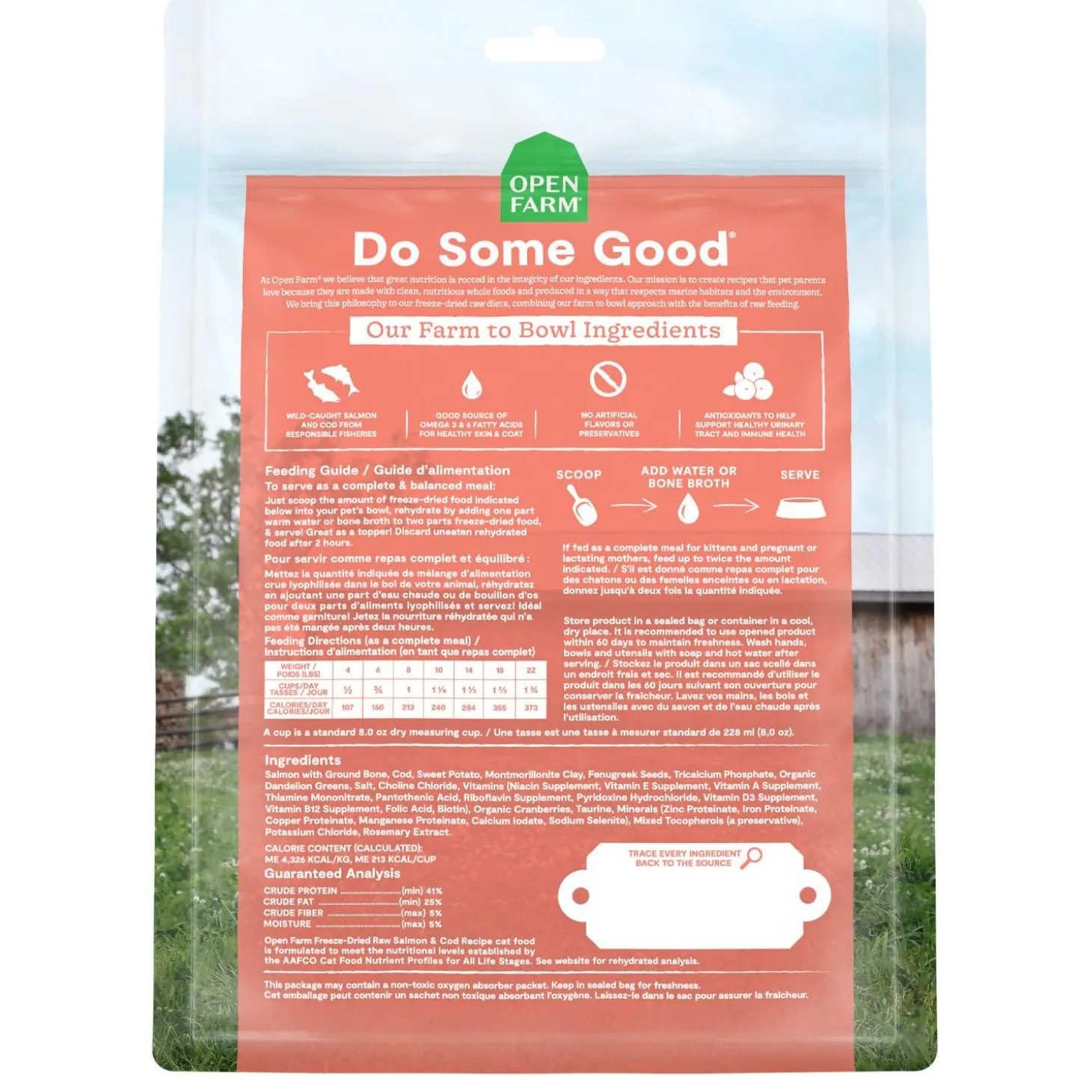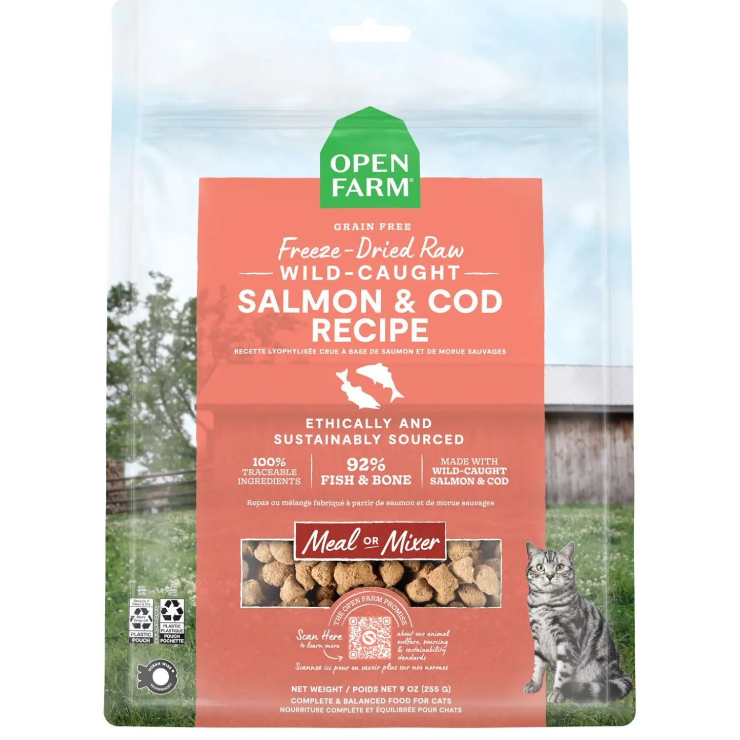 Open Farm Freeze-Dried Salmon & Cod Recipe Cat Food is a nutritious and great tasting recipe and can be used as a complete meal or mixer. Featuring a delicious protein combo of fresh beef and Ocean Wise approved wild-caught salmon, along with organic veggies and superfoods. All specifically formulated for cats.