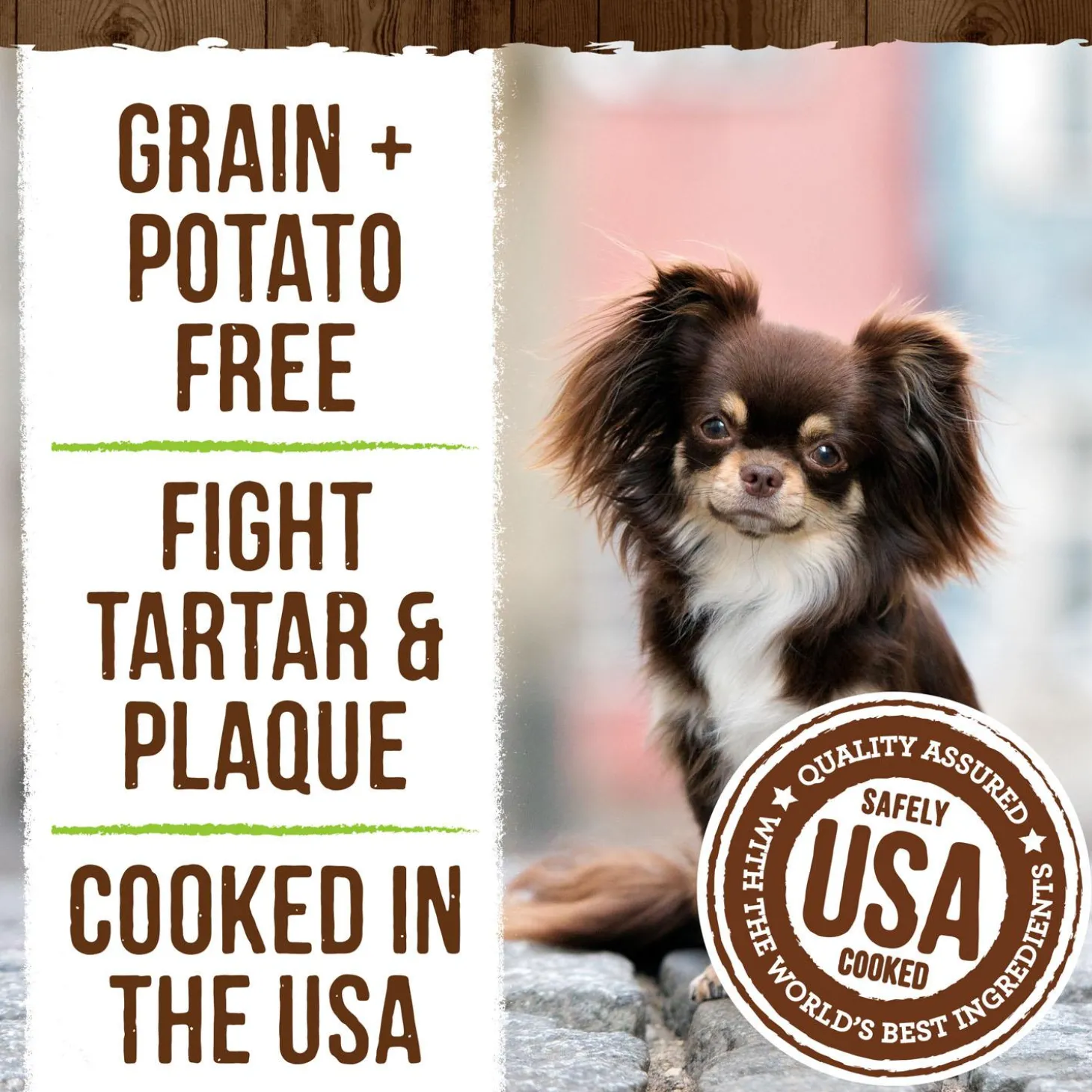 - Grain free dog treats are potato free. Cooked in the USA, these dog treats for small dogs weighing 5 to 15 pounds fight plaque and tarter