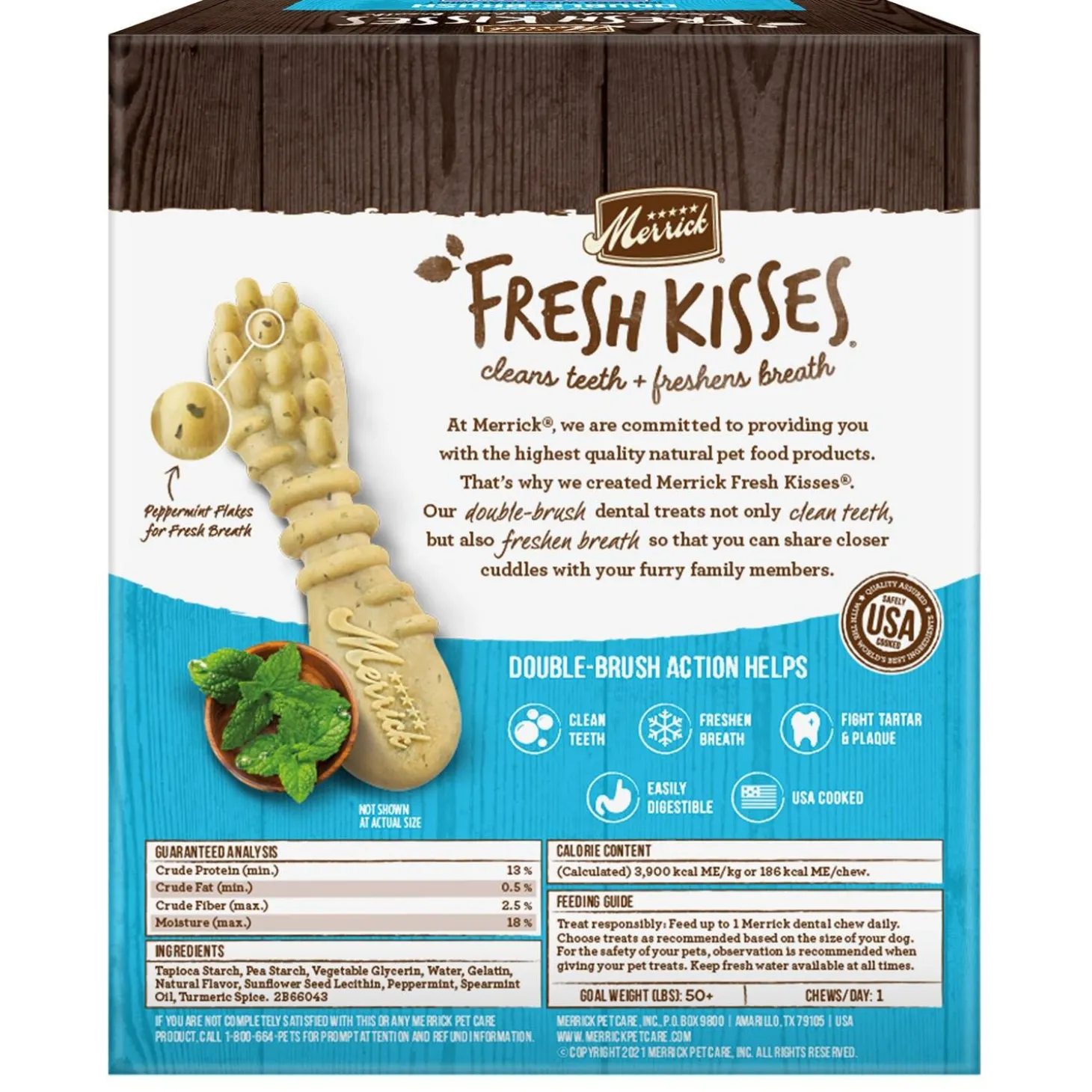 Merrick Fresh Kisses Double-Brush Real Mint Large Breed Dog Treats are sized specifically for large breed dogs weighing over 50+ pounds, these all natural dog chews deliver two big benefits: dog teeth cleaning and truly fresher breath. The double-brush design mint dog chews clean your dog’s teeth like no other dental dog treats. These grain free dog treats infused with real mint are also potato free. With only 10 ingredients, these extra small dog chews will be a hit. Fresh Kisses dental chews for dogs are soft dog treats to effectively fight plaque and tartar from your small dog’s teeth as they chew, yet tough enough to last while they enjoy a happy chewing session. Merrick dog treats have peppermint flakes for fresh breath. Small dog treats are crafted in Hereford, TX kitchen and cooked in the USA. Chewy dog treats are easily digestible mini dog treats. Make sure to feed daily to clean teeth and freshen breath.