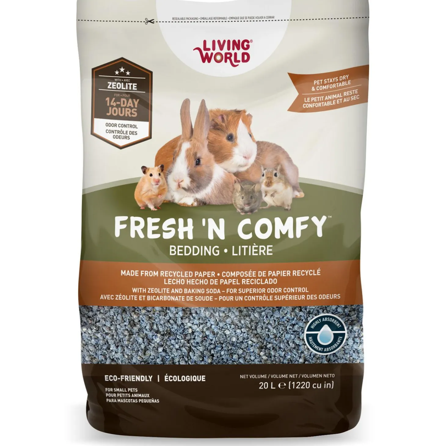 Living World Fresh ‘N Comfy Blue Bedding is environmentally friendly, safe and comfortable for small pets. Made from biodegradable recycled newspaper, Fresh ‘N Comfy is dust free and does not contain phenols or scented oils that can be harmful to the respiratory system of small animals. The bedding contains baking soda, which provides more absorbency, superior odour control, and allows the bedding to last longer between cage changes. The bedding is suitable for all small animals, reptiles, birds and cats. Bedding is important because it provides a natural burrowing and nesting environment that stimulates superior environmental enrichment.