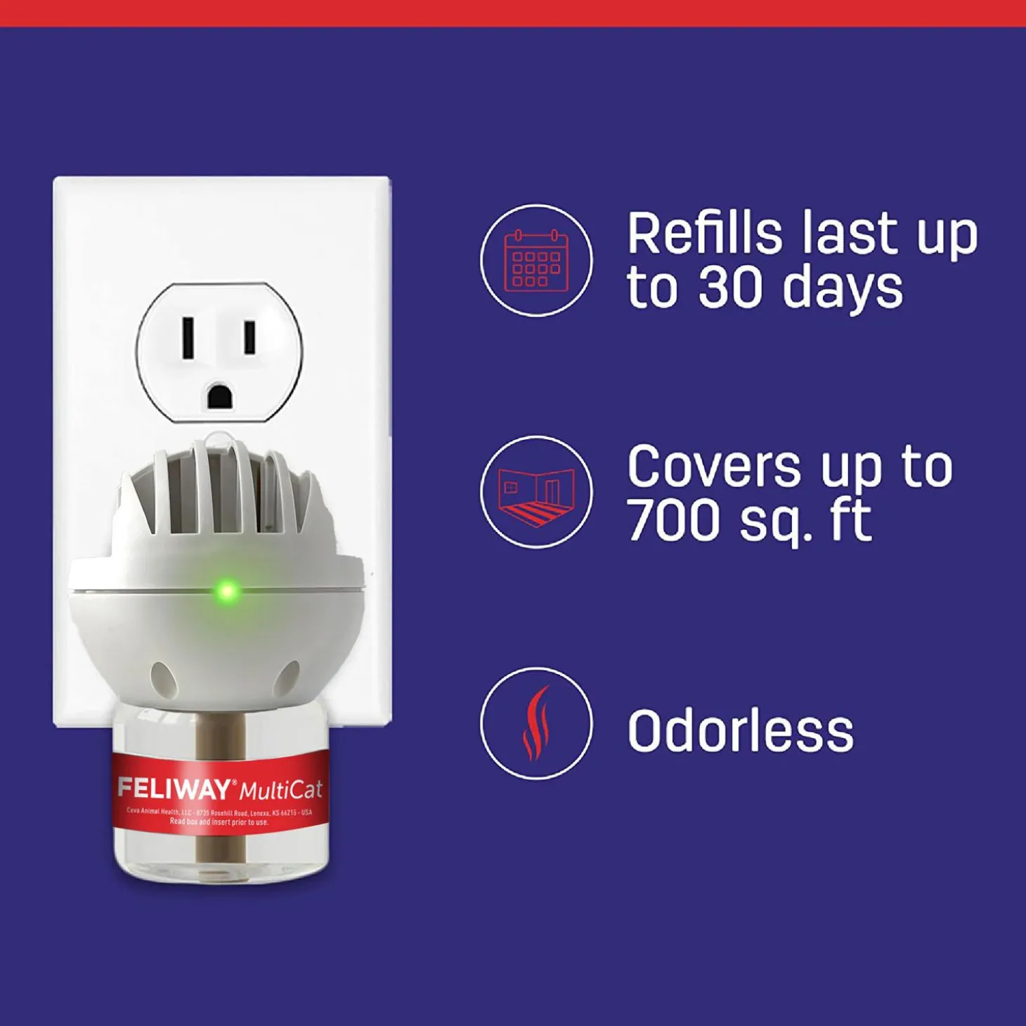 Use: Simply insert the refill into the diffuser and plug it directly into the outlet. Each diffuser will cover 700 square feet. For best results, keep the diffuser plugged in 24/7 and replace with a FELIWAY Friends Diffuser refill every 30 days. The diffuser must be replaced every 6 months. Use only in properly functioning 120-volt electrical outlets. Do not use with extension cords, adapters, or converters. Best results are typically seen after 3 to 4 weeks of continuous use. Use only FELIWAY Refills with FELIWAY Diffusers.