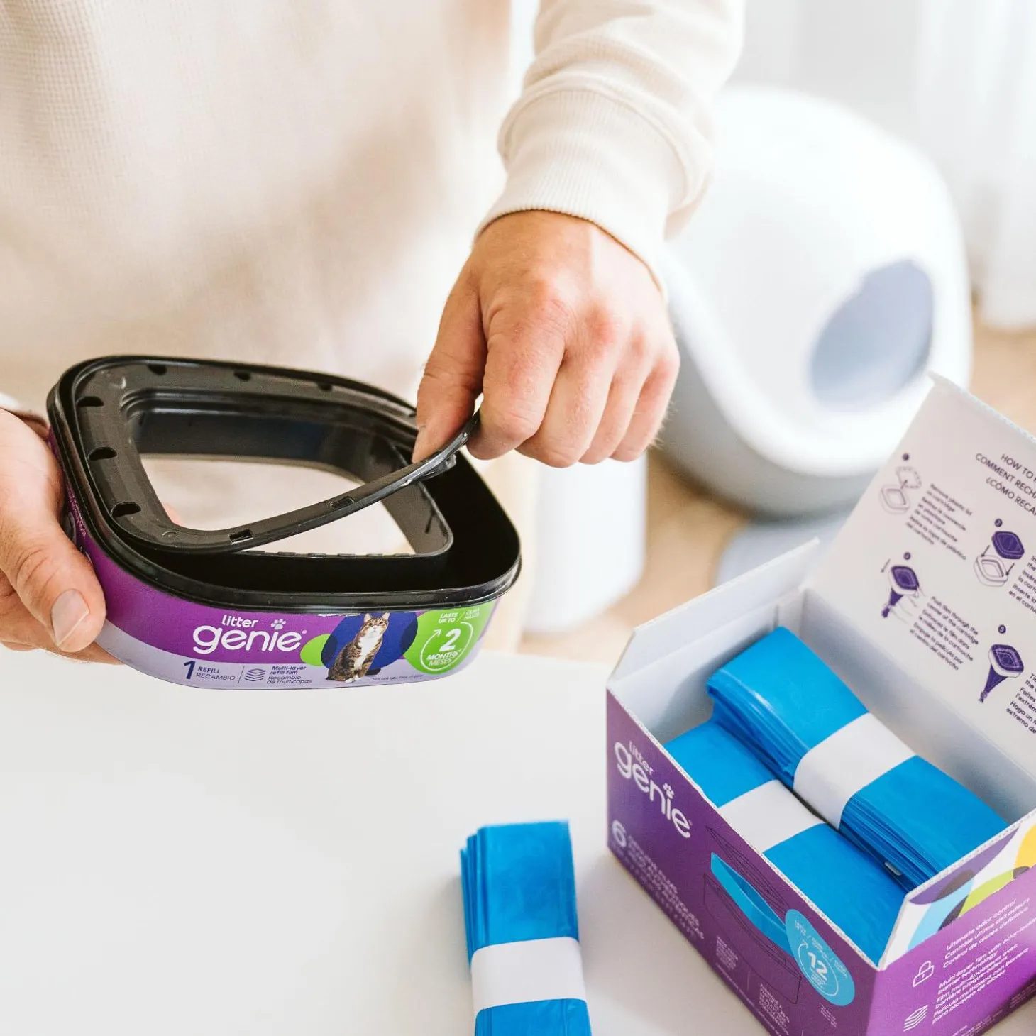 Litter Genie Genuine Film offers a more sustainable approach to help the environment. The cartridge is not included, however, the film contains 25% post-consumer recycled material, reducing waste. Each pack provides 3 rolls, each measuring 14 feet, offering up to 6 months of use for one cat. When it’s time to replenish, simply reuse your Litter Genie Standard or Jumbo cartridge by inserting our genuine film. The multi-layer film with odor barrier technology, effectively seals in litter odours, ensuring your home stays fresh.
