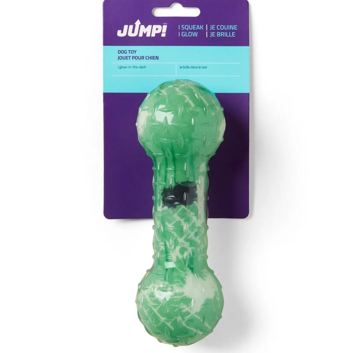 JUMP! Glow Dumbbell Dog Toy is a fetching good time. Durable, this rubber toy is ready for play and heavy chews. Charges quickly in bright sunlight for long-lasting illuminated play.