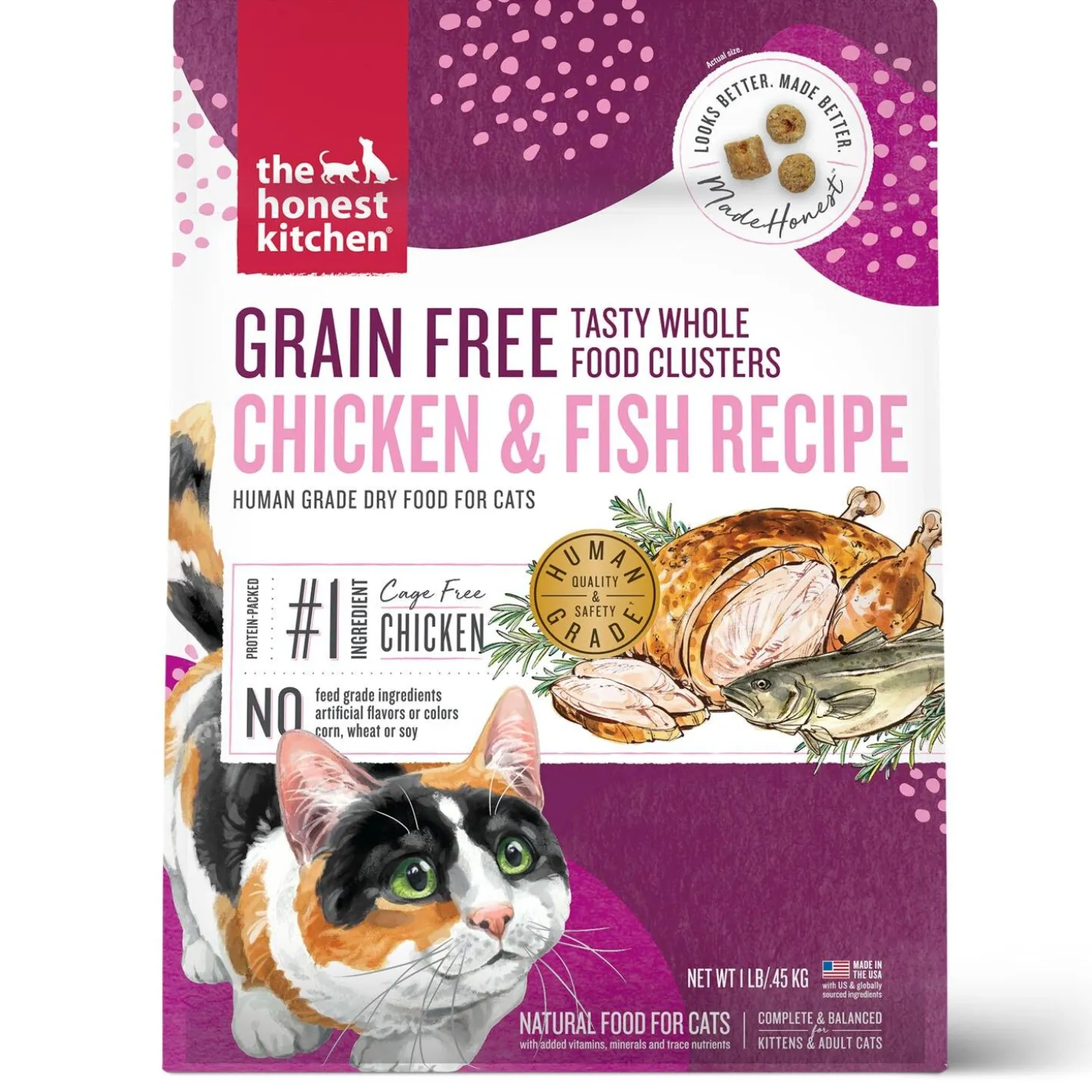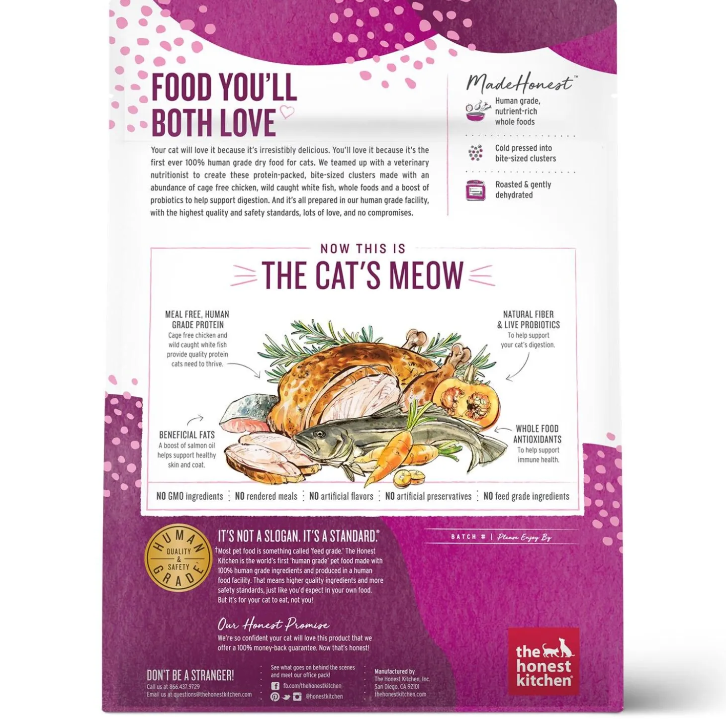 Honest Kitchen Grain Free Clusters Chicken & Whitefish Recipe Cat Food is irresistibly delicious – your cat will love this savoury recipe and you’ll love it because it’s the first ever 100% human grade dry cat food. Veterinary nutritionist were involved to create these grain free, protein-packed, bite-sized clusters made with an abundance of cage free chicken and wild caught fish, whole foods and a boost of probiotics to help support digestion. This grain free cat food is all prepared in a human grade facility with the highest quality and safety standards, lots of love and no compromises.