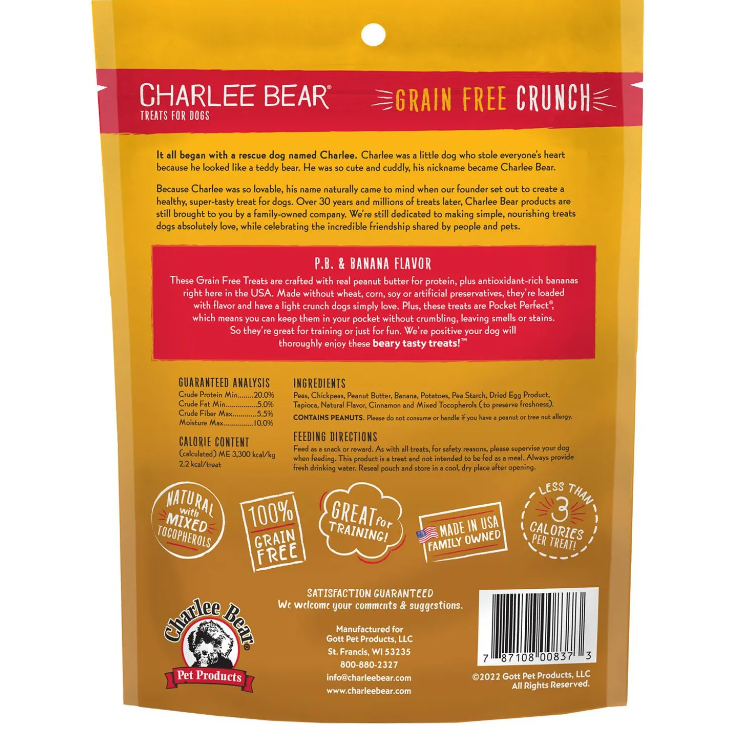 Charlee Bear Grain Free Crunch P.B & Banana Flavour Dog Treats are crafted with real peanut butter for protein and antioxidant-rich bananas right here in the USA. Made without wheat, corn, soy or artificial preservatives, they’re loaded with flavour and have a light crunch dogs simply love. Plus, these treats are Pocket Perfect, you can keep them in your pocket without crumbling, leaving smells or stains. So they’re great for training or just for fun. Your dog will thoroughly enjoy these beary tasty treats!