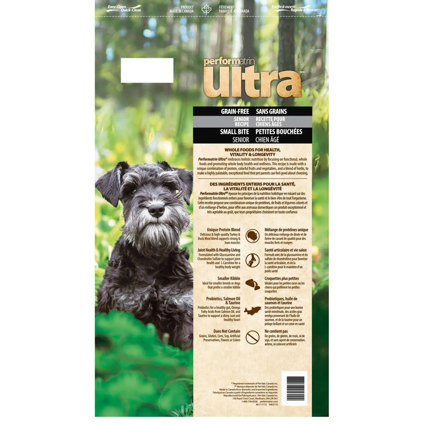 Performatrin Ultra Grain-Free Senior Recipe Small Bite Dog Food embraces holistic nutrition, focuses on functional whole foods, and is designed to meet the needs of your senior dog. Made with high-quality turkey as the first ingredient, and balanced fat content to help maintain lean muscle. It also includes Glucosamine & Chondroitin to support joint health and L-Carnitine to maintain a healthy weight. This recipe meets your senior dog’s daily requirements and promotes whole body health and wellness in a smaller kibble size.
