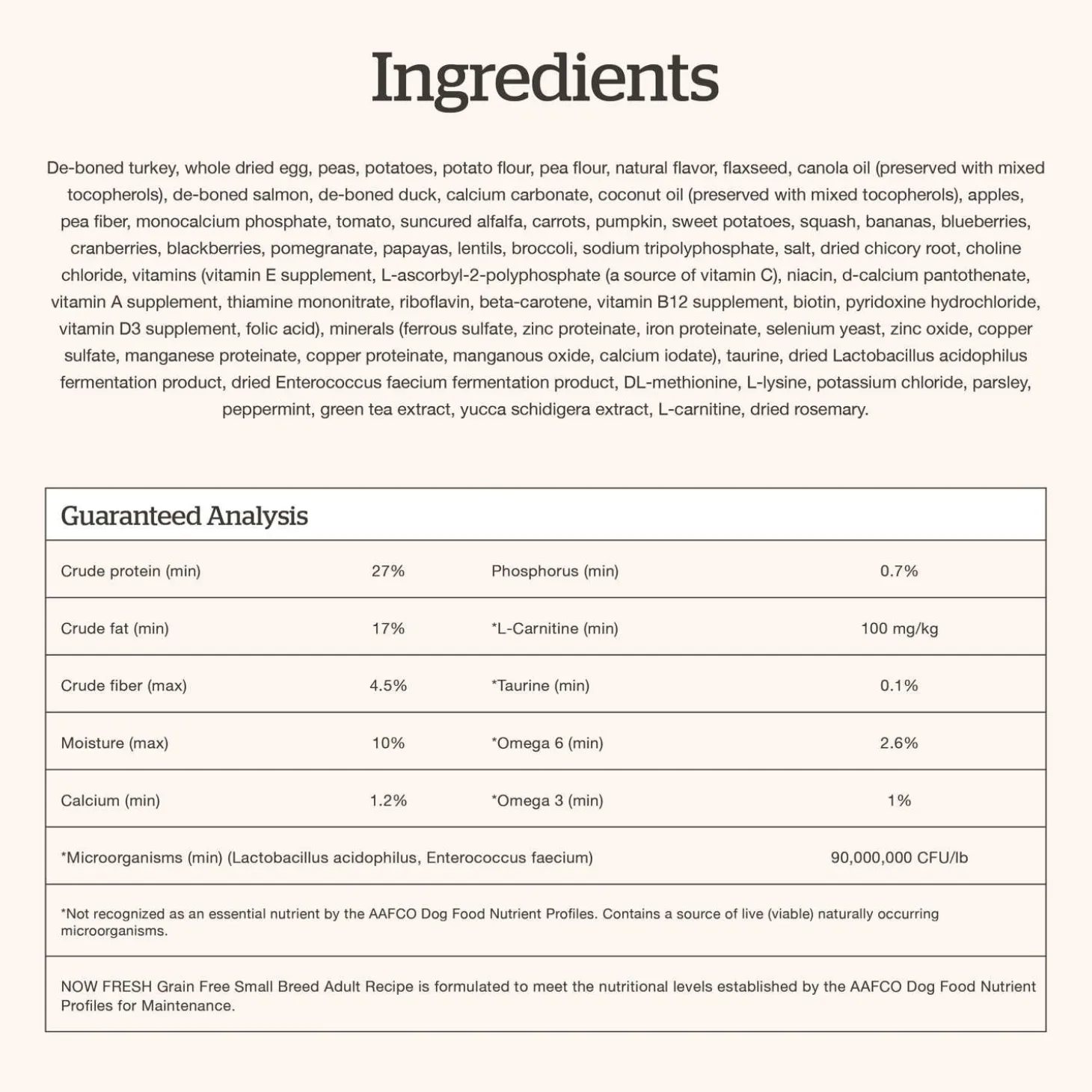 Now Fresh Grain-Free Turkey, Salmon & Duck Recipe Small Breed Adult Dog Food combines “delicious” with “nutritious”. Using highly digestible fresh turkey, duck, and salmon as protein sources to support muscle maintenance, fibre-rich pumpkin and sweet potato to help with digestion, and the omega-3s found in flaxseed to help maintain a shiny coat. For the tiny companions with big personalities, this special recipe is crafted to meet their unique needs. It’s specially designed with small kibble sizes for little mouths, making it easier for your furry friend to enjoy each bite. Additionally, it’s infused with natural breath fresheners like parsley and peppermint, keeping their breath as sweet as their demeanor.