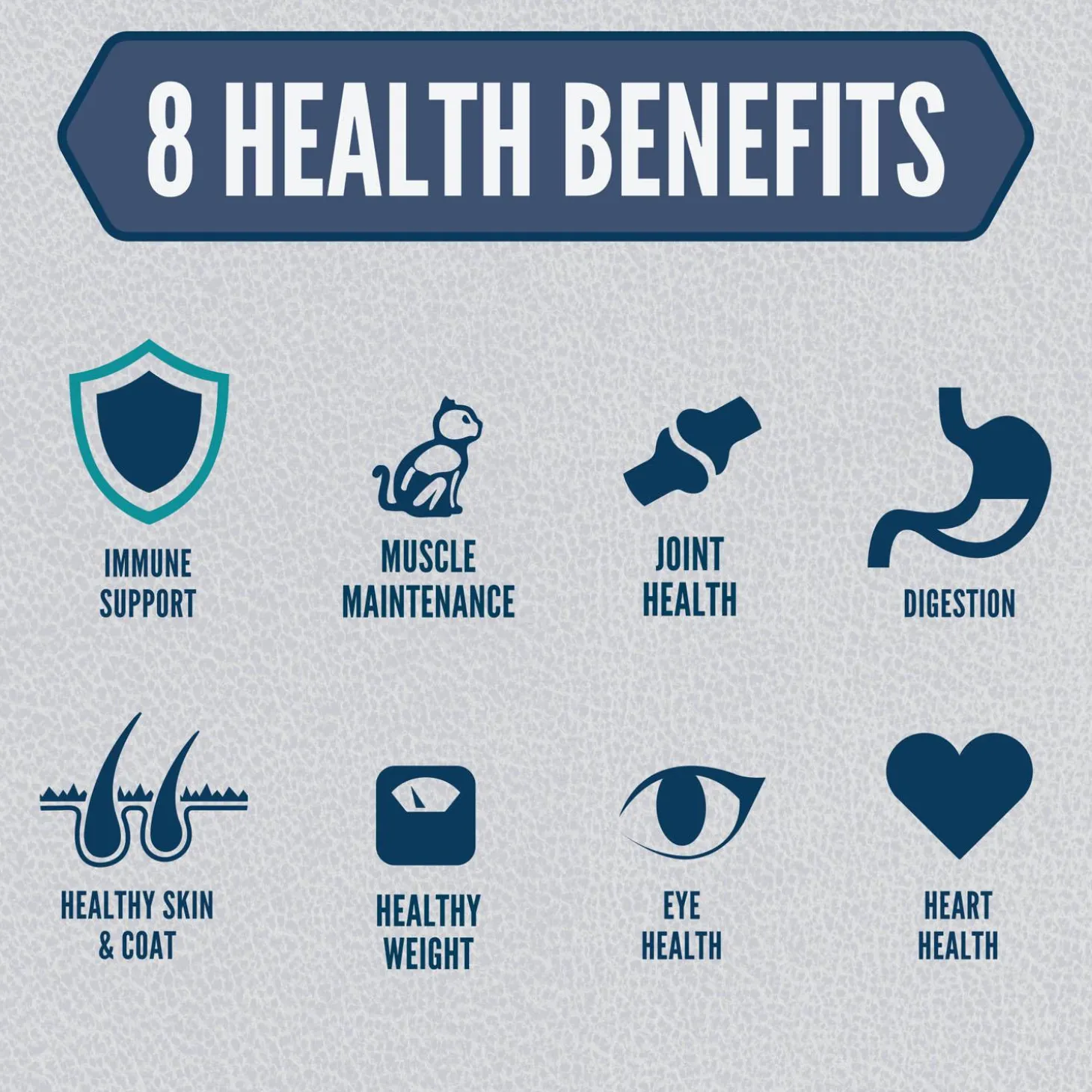 - Helps support 8 key health benefits including Immune Support, Digestion, Healthy Skin & Coat, Heart Health, Lean Muscle Maintenance, Healthy Joints & Bones, Healthy Weight, and Eye Health.