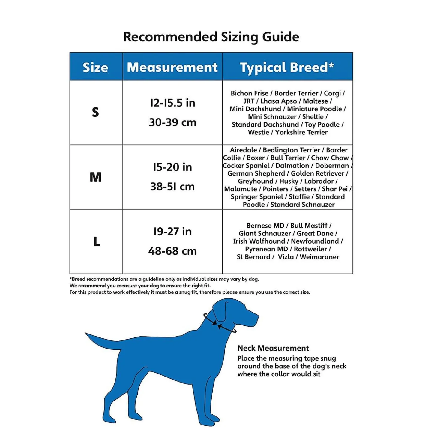 | Large | 19-25in 48-64cm | Bullmastiff, Giant Schnauzer, Great Dane, Newfoundland, St Bernard |
