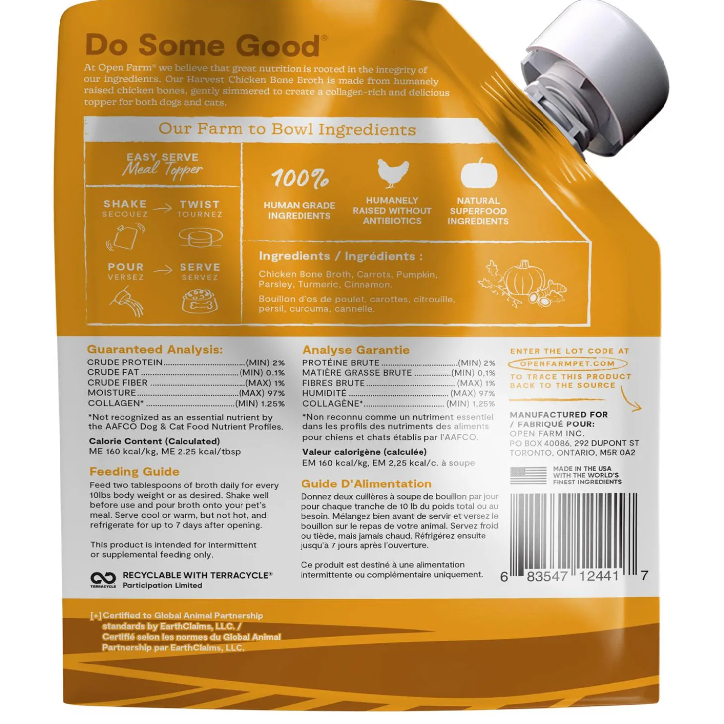 Open Farm Harvest Chicken Bone Broth Dog & Cat Meal Topper is known to be a superfood, super-soup or super delicious. Whatever you call it, our broth comes from ethically raised chicken. The bones are slowly simmered with functional ingredients like locally sourced non-GMO pumpkins and carrots, and superfoods like turmeric. And it’s made specifically for pets free of antibiotics, growth hormones, salt, garlic, and onion. Serve as topper for dry food or to rehydrate our Freeze Dried Raw recipes.