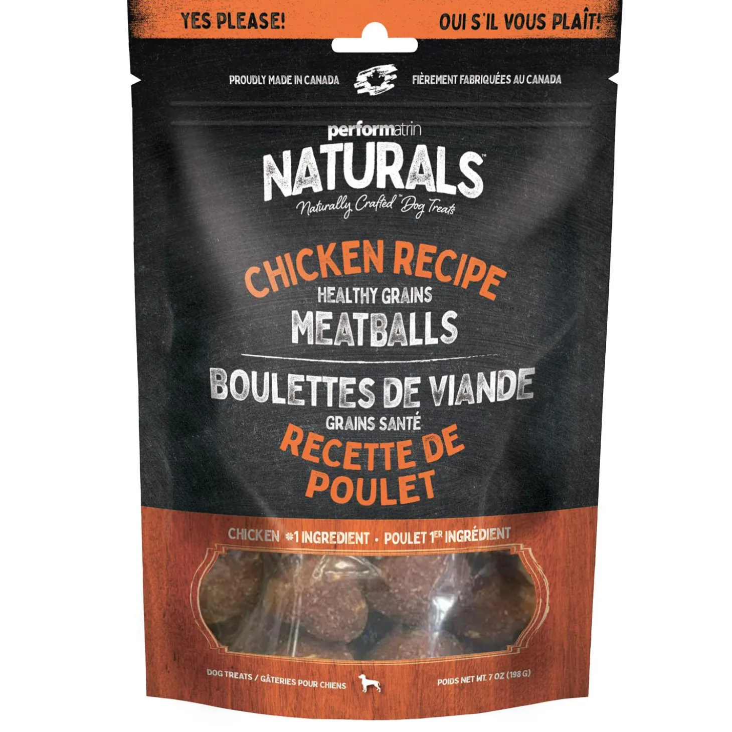 Performatrin NATURALS Healthy Grains Meatballs Chicken Recipe treats are a savoury, homestyle treat, where protein is the first ingredient. Our pets are family. Feel good about treating your dog with Performatrin NATURALS dog treats. Naturally crafted, from our family to yours.