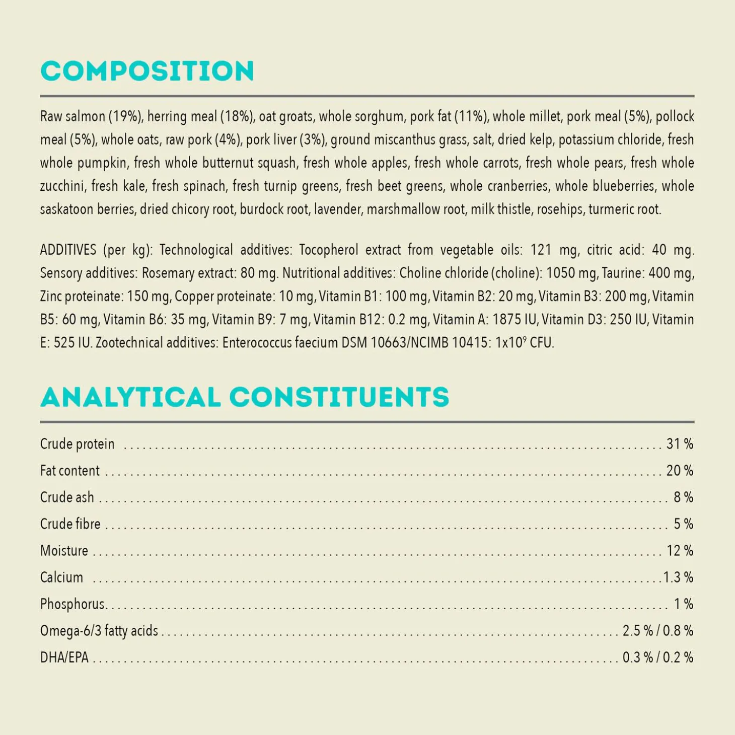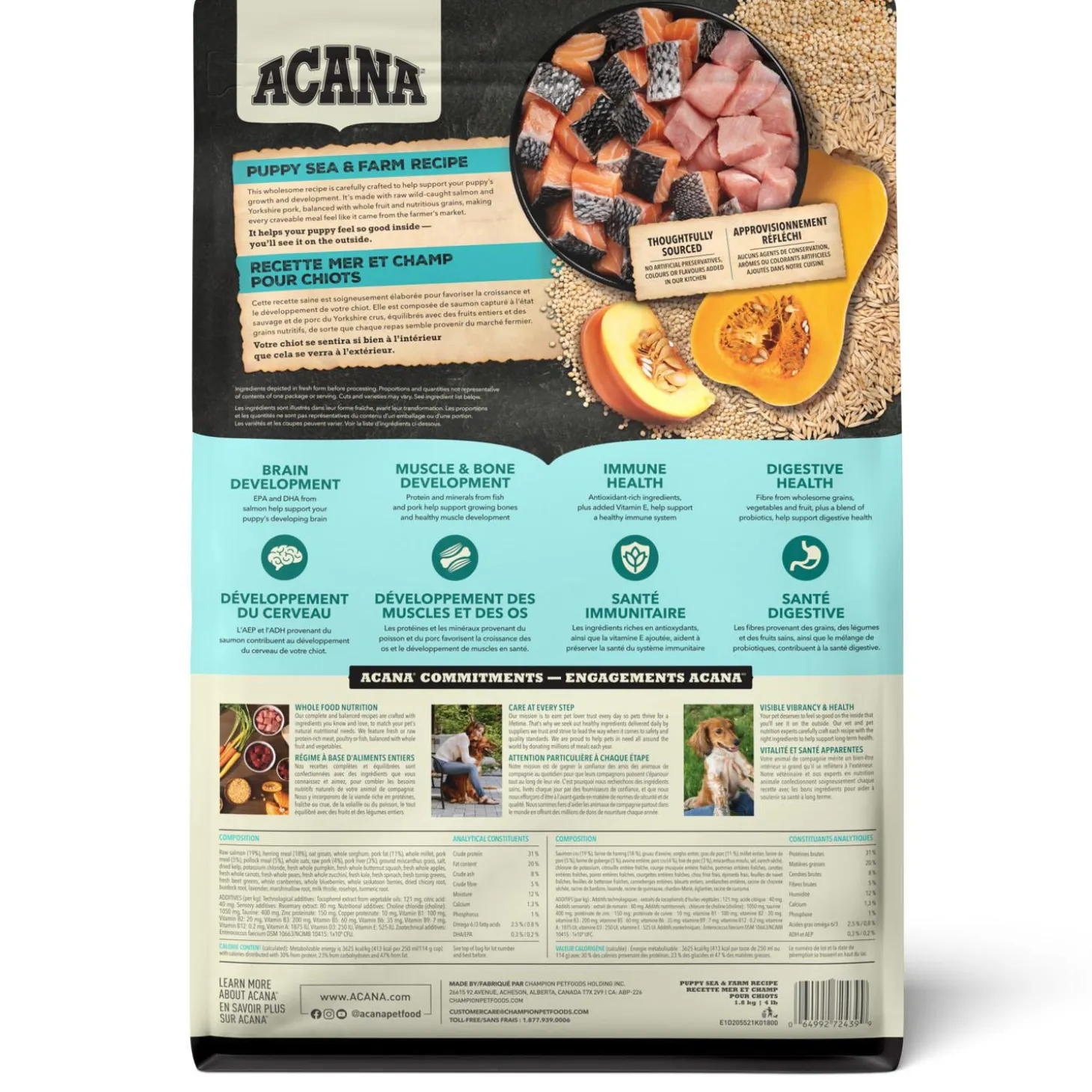 ACANA Healthy Grains Sea & Farm Recipe Puppy Dog Food is a poultry-free recipe specially crafted to support your puppy’s development with raw wild-caught salmon and Yorkshire pork. Its also balanced with healthy grains in the form of oats, sorghum and millet. These grains are high in fibre and gluten-free, offering added nutrition that helps support a healthy digestive environment. This Puppy Sea & Farm Recipe is crafted with 65% protein-rich animal ingredients* balanced with 35% wholesome grains, vegetables, fruit, botanicals and nutrients**. Plus, it helps support key health benefits for your puppy including Brain Development and Muscle and Bone Development. Help support your puppy’s growth and development with a nutritious and delicious protein-rich food.