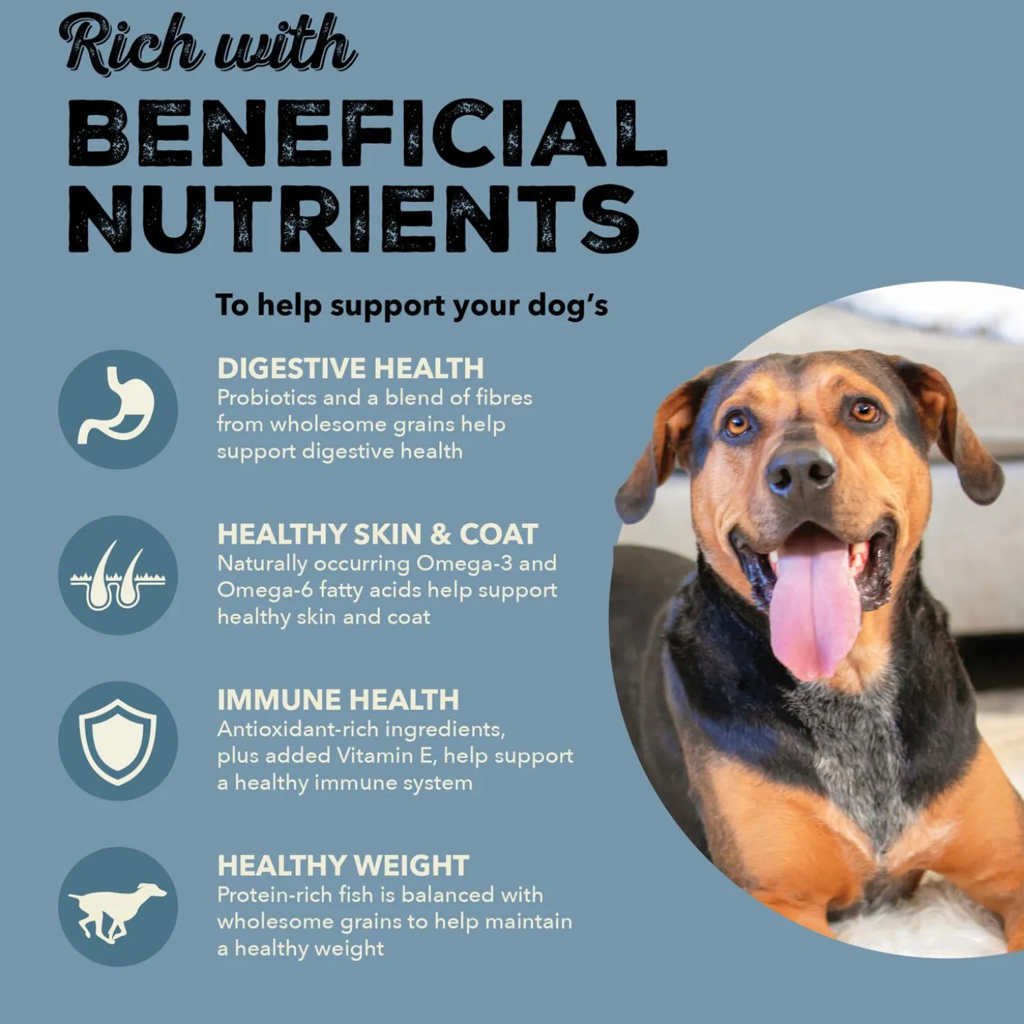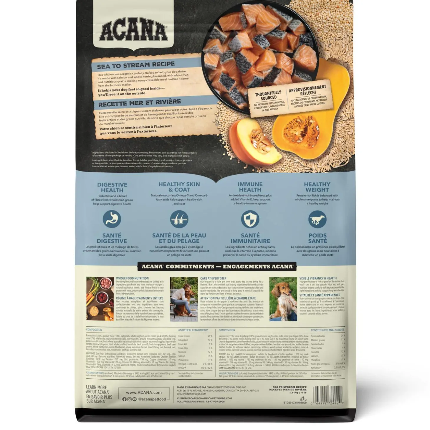 ACANA Healthy Grains Sea to Stream Recipe Adult Dog Food is rich with protein from fish and specially crafted with a blend of raw salmon, herring and trout. Its also balanced with healthy grains in the form of oats, sorghum and millet. These grains are high in fibre and gluten-free, offering added nutrition that helps support a healthy digestive environment. This Sea to Stream Recipe is crafted with 60% protein-rich fish ingredients* balanced with 40% wholesome grains, vegetables, fruit, botanicals and nutrients** and helps support 4 key health benefits. The result is a protein-rich, nutritious and delicious food to help your dog live a full, happy life.