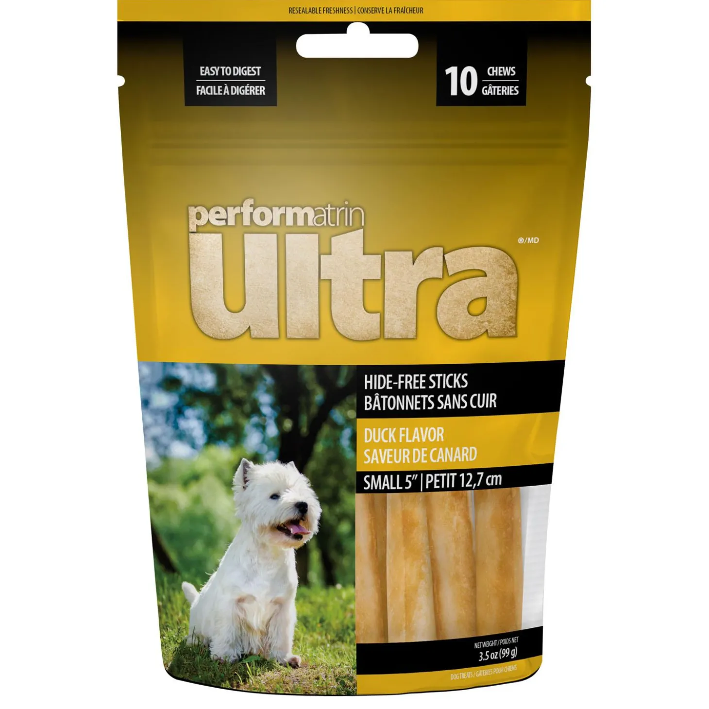 Performatrin Ultra Hide-Free Stickz Duck Flavour 5in Dog Treats are an all-natural, easily digestible alternative to Rawhide. They fulfill your dogs natural chewing instincts which supports healthy teeth and gums.