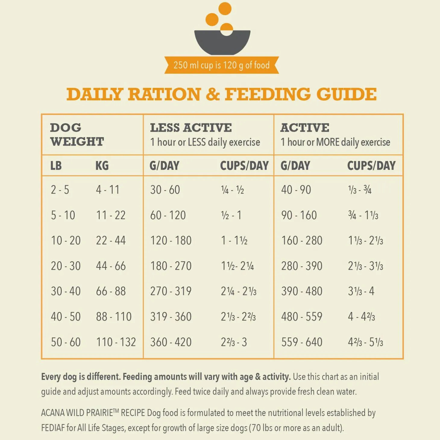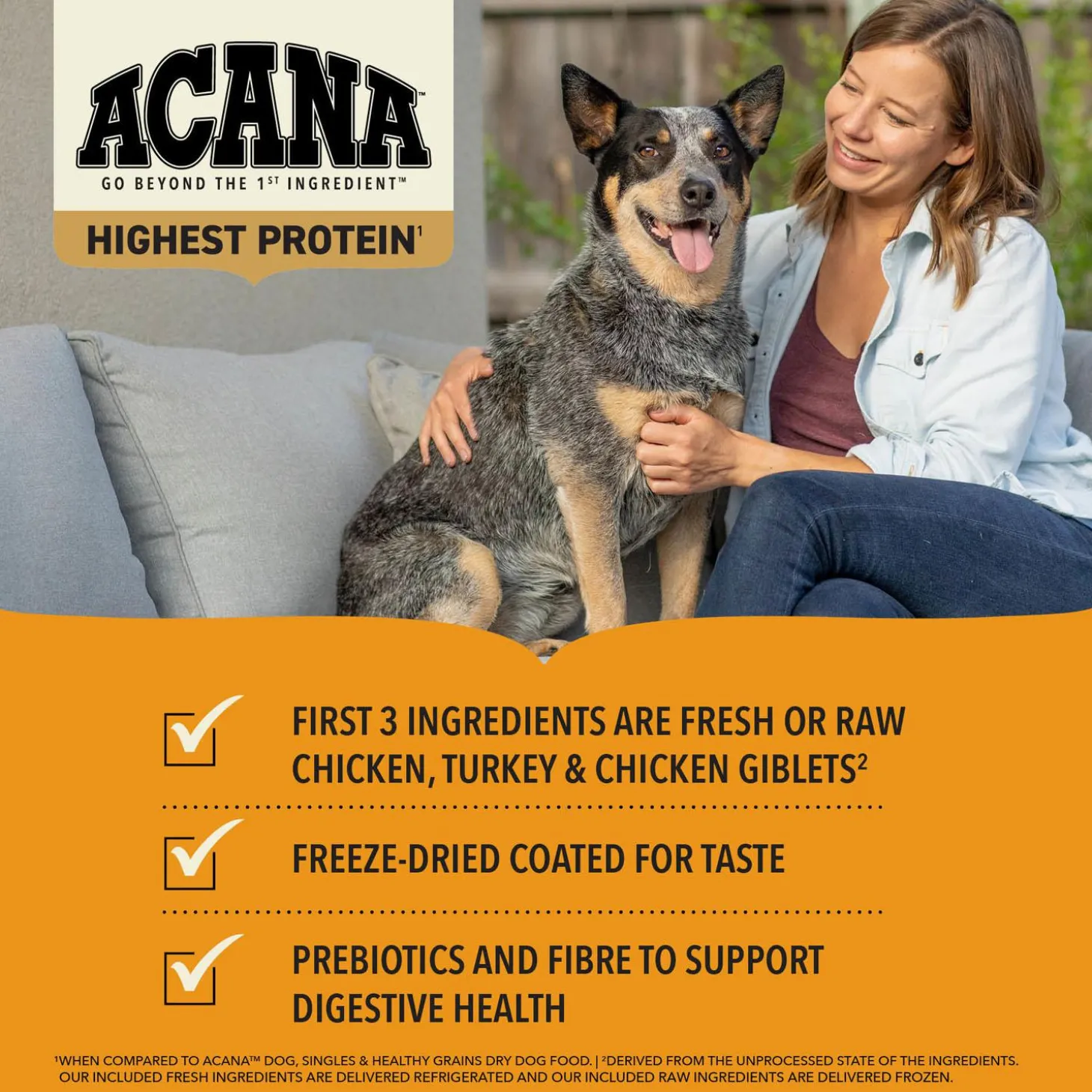 *Approximate and derived from the unprocessed state of the ingredients. **ACANA free-run chickens and turkeys are not housed in cages and are able to move in a barn without outdoor access. ***ACANA also adds vitamins, minerals, natural preservatives and probiotics. ****Produced in a facility that also processes grains. The included fresh ingredients use refrigeration as the sole method of preservation and the included raw ingredients are frozen at their peak freshness.