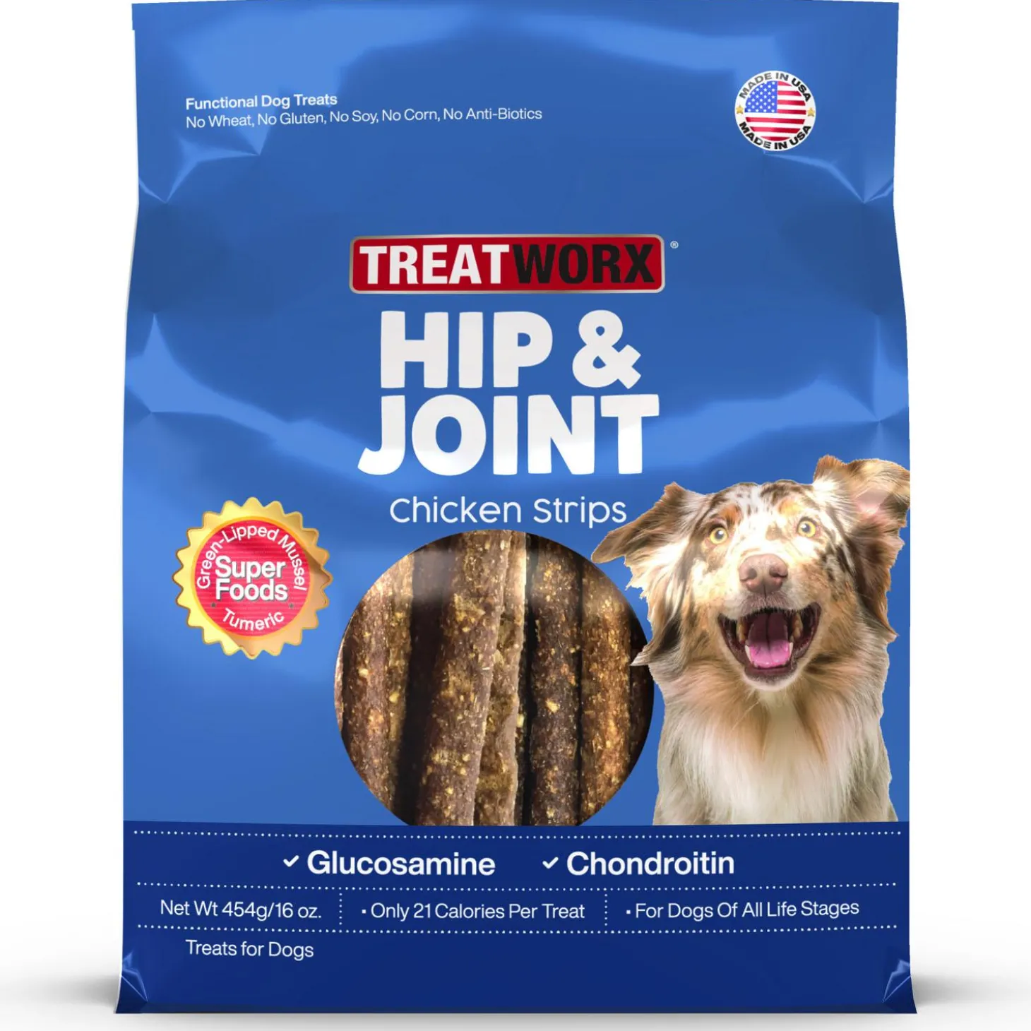 Treatworx Hip & Joint Chicken Strips Dog Treats are 100% natural treats containing glucosamine & chondroitin. Made with real chicken and only 21 calories per treat, these tasty treats are are great reward for dogs of all life stages.