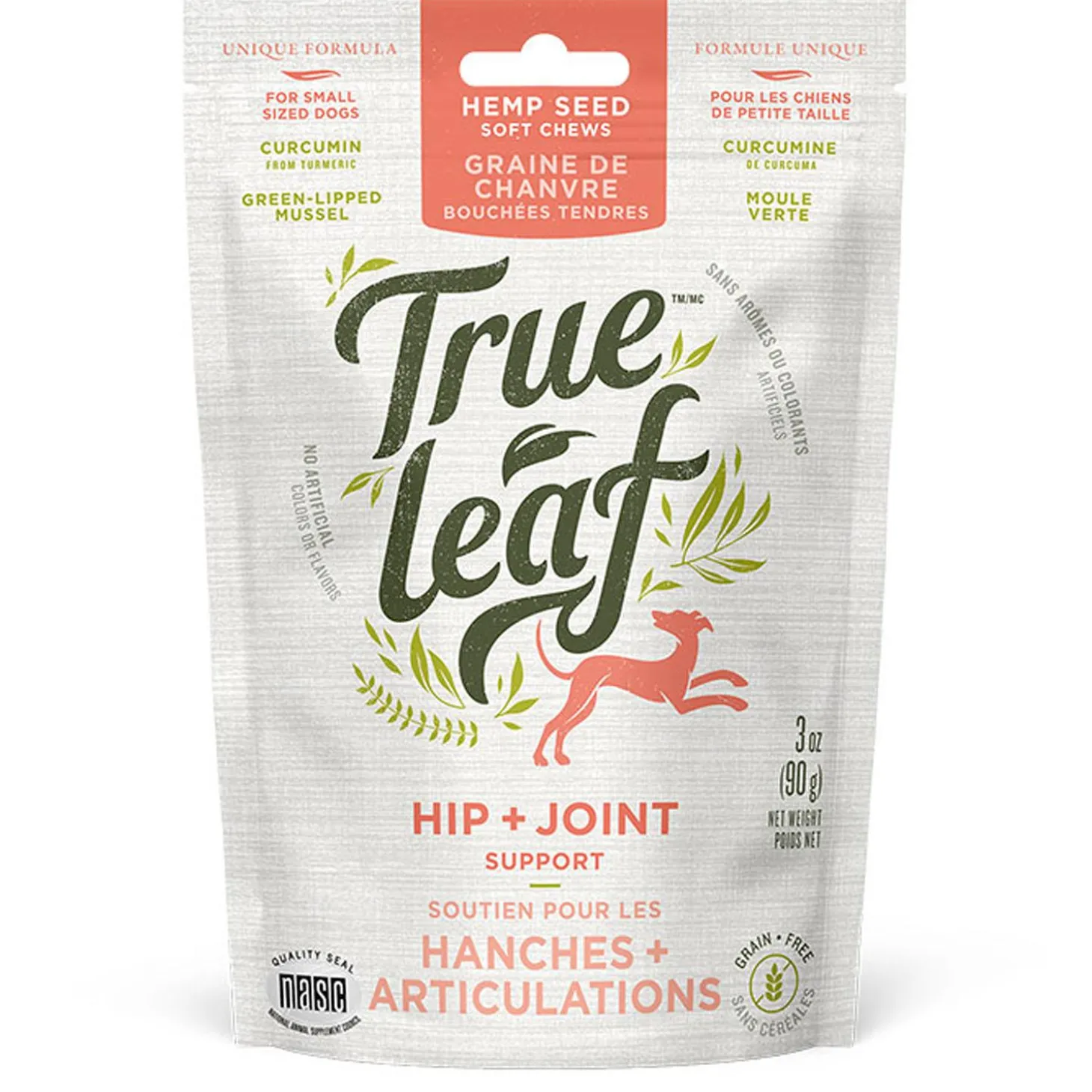 True Leaf Hip + Joint Support Chews Small Dog Supplements contain a balanced combination of omega fatty acids (3, 6 and 9) that support the formation and function of normal joint tissue. This combination comes from fresh, Canadian-grown, high quality hemp seed oil and high-fat green lipped mussels from New Zealand. Green lipped mussels are used as a rich source of Chondroitin, Glucosamine, EPA, DHA and rare ‘ETA’, known to improve joint function. In addition, True Leaf added turmeric powder that contains 95% curcuminoids, which is traditionally used in Ayurvedic medicine as an antioxidant and to support joint health. These chews were formulated with veterinary oversight to provide your pet with the optimal blend of ingredients that are not only as ‘natural’ as possible but also backed with scientific research to support normal joint function and contribute to your pet’s active lifestyle.