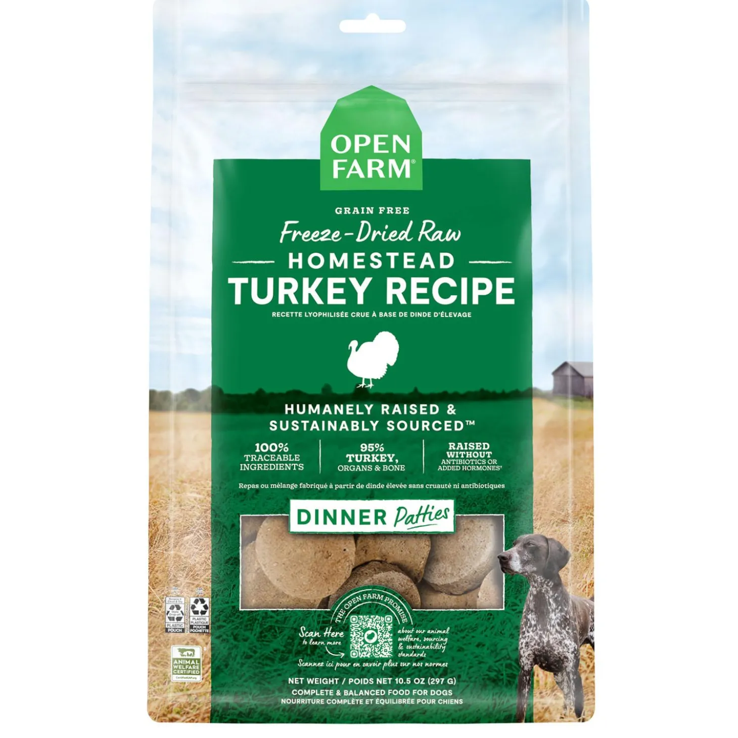 Open Farm Homestead Turkey Recipe Patties Freeze Dried Dog Food is a single-protein recipe that is an irresistible ready-to-eat, complete meal! Containing a combination of humanely raised raw turkey without antibiotics or hormones, with added organic veggies and superfoods.