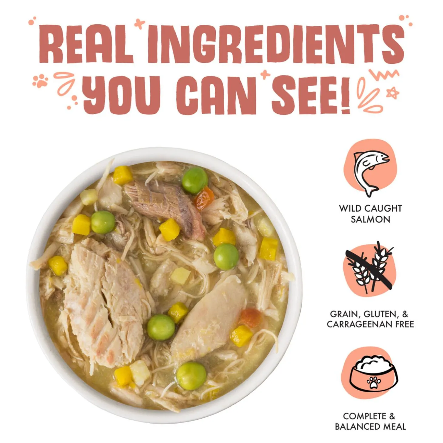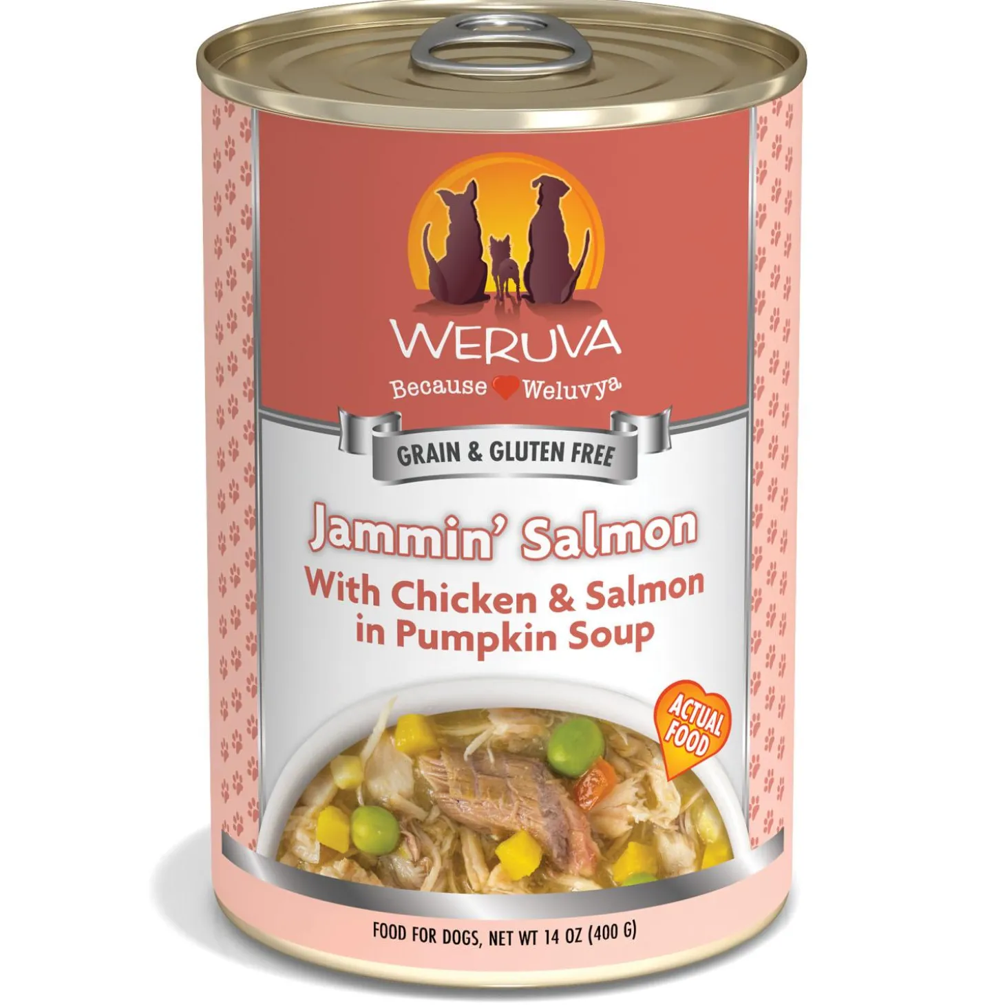 Weruva Jammin’ Salmon with Chicken & Salmon in Pumpkin Soup Dog Food will have your dog jammin’ to the tune of boneless, skinless, white breast chicken and wild caught salmon, loaded with Omega-3s for healthy skin and coat. Made with tomatoes, green peas and sweet potato in a pumpkin soup-made without added antibiotics or hormones.