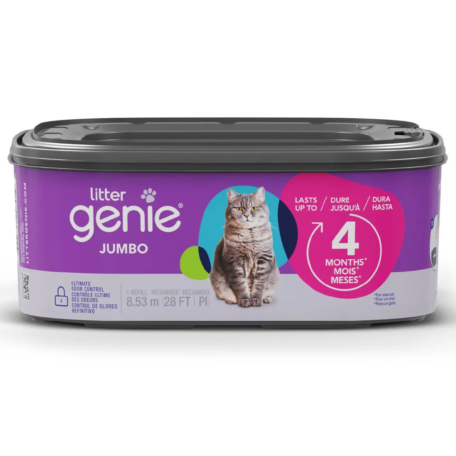 Litter Genie Jumbo Bag Refill offers 8.5m (28 ft) of refill film that can last up to 4 months for one cat, so you won’t have to constantly worry about buying and changing refills. Made with a multi-layer refill that contains odours and keeps your home fresh and clean. Disposing of your soiled cat litter has never been so fast and easy.