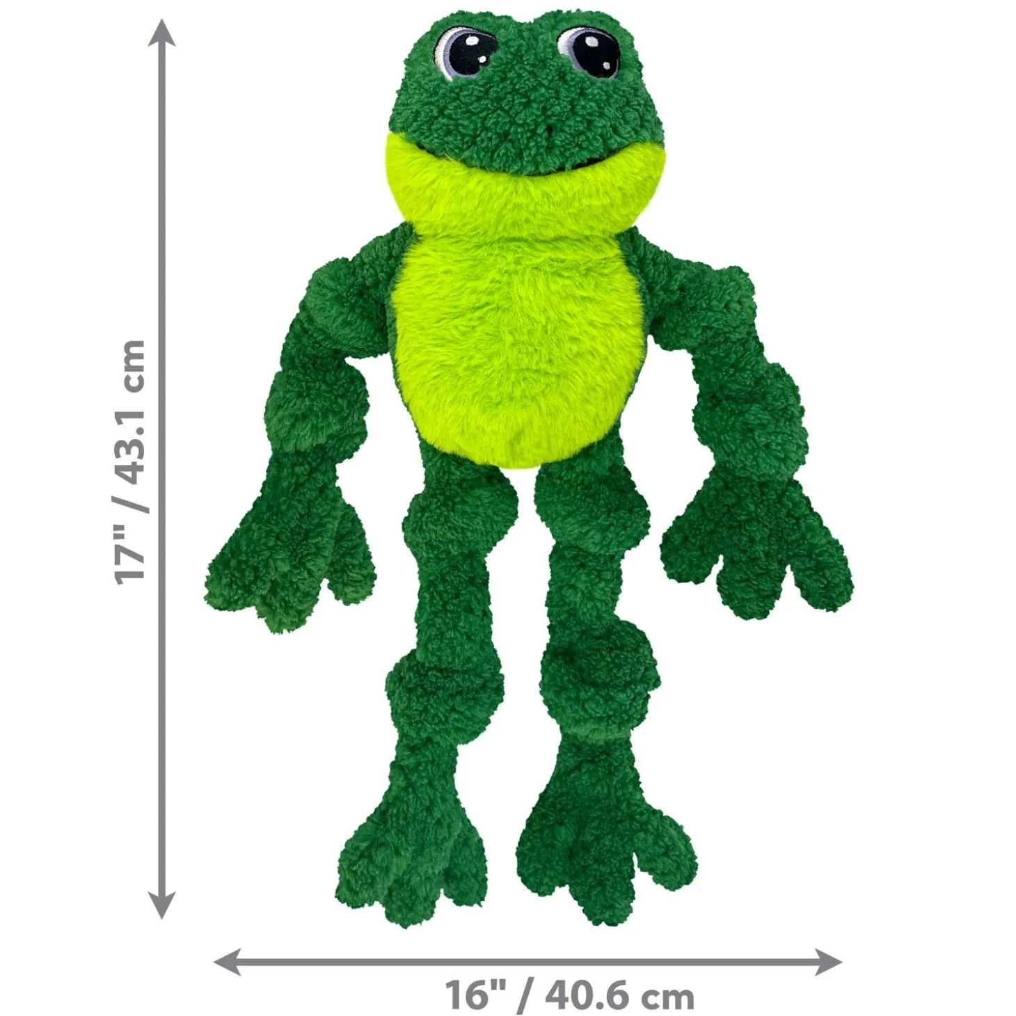 KONG Knots Frog Dog Toy will add a variety of fun to your dog’s toy basket! This oversized amphibian’s full-body rope skeleton creates durability & heft for a variety of playstyles like tugging, thrashing, carrying, and gnawing. A squeaker in the head entices extended playtime, while its soft, dual-plush fur invites cuddling during quiet time. Unique details like cute froggy fingers and embroidered facial features make this frog the perfect match for your dog.