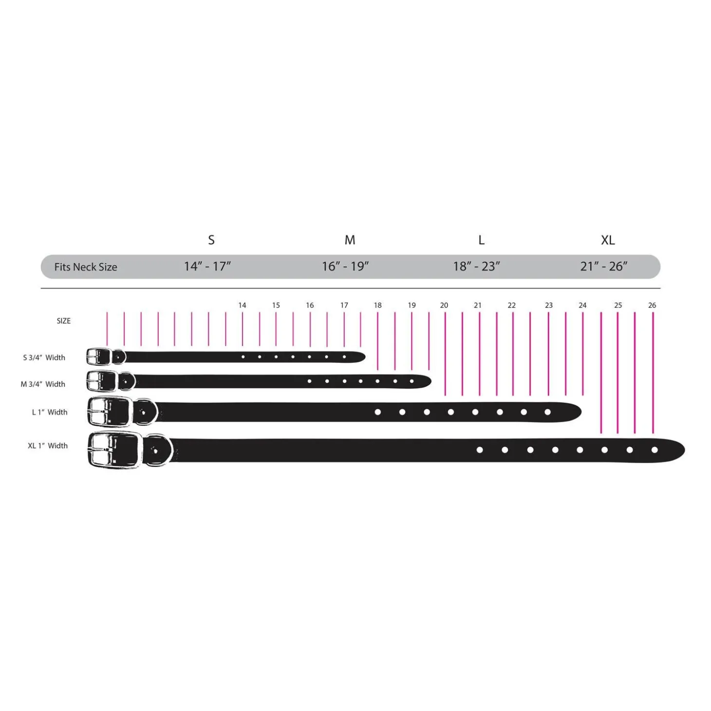 | Small | 3/4″ (0.65cm) | 14″-17″ (35.56cm-43.18cm) |