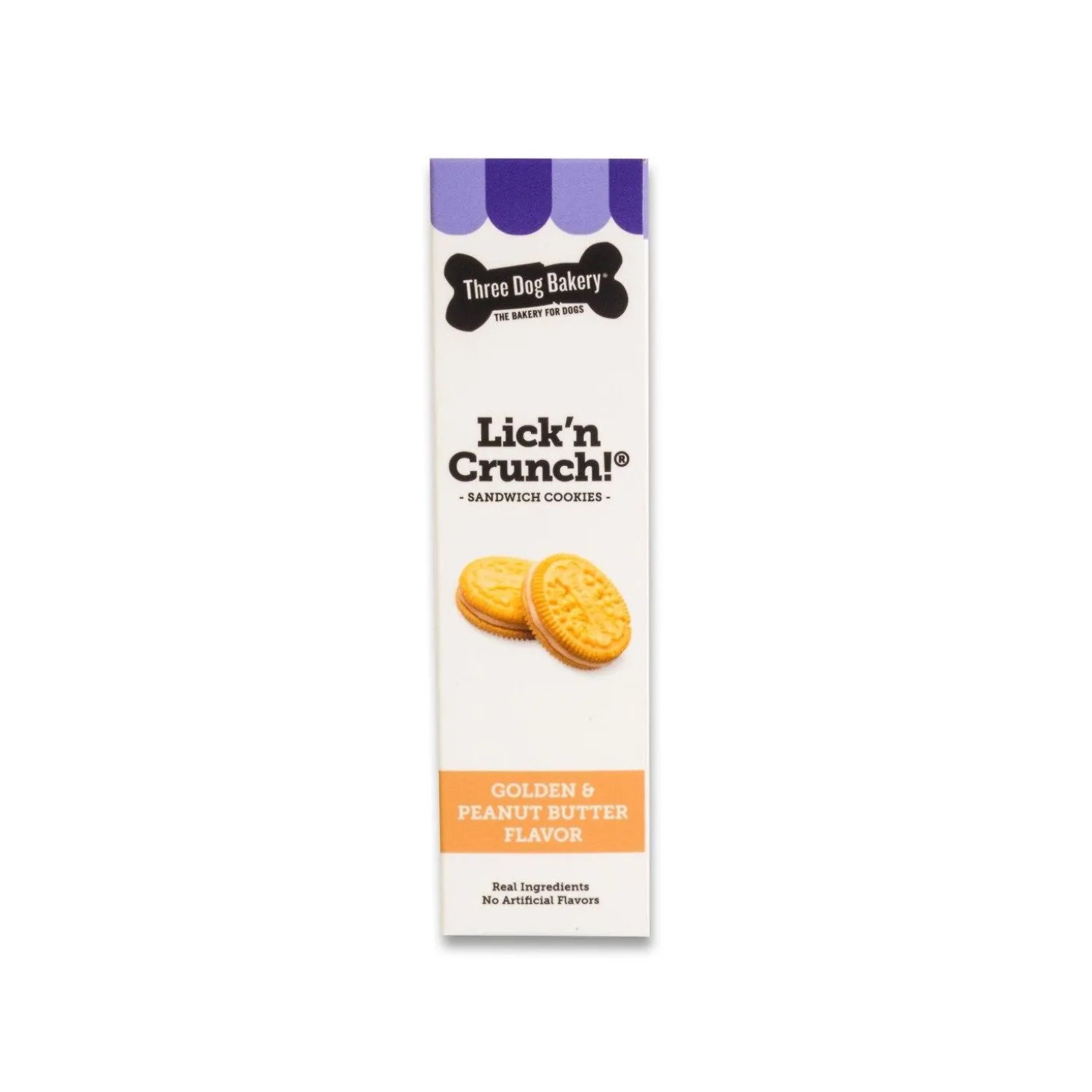 What do you get when you take two golden vanilla cookies and sandwich them around drool-worthy peanut butter filling? Easy. Three Dog Bakery Lick’n Crunch! Sandwich Cookies are a wholesome reason to spoil your dog anytime with a treat made from real ingredients like wheat flour, and peanut butter.