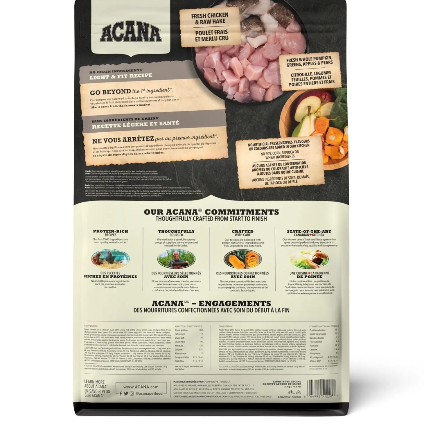 ACANA Light & Fit Recipe Adult Dog Food has premium recipes made right here in Canada. That’s why the Light & Fit Recipe is thoughtfully crafted to nurture your dog with lower calories than other ACANA Dog recipes, and plenty of lean animal protein. Made with 65%** quality animal ingredients like fresh free-run* chicken and raw hake balanced with 35% fruit and vegetables*** like fresh whole pumpkin, greens, apples and pears, this recipe provides the nutrition and animal protein your dog needs to live their best life. These wholesome ingredients are provided by suppliers we know and trust, and our vets and pet nutrition experts carefully craft each recipe with the goal of making your pet feel so good inside, you’ll see it on the outside.