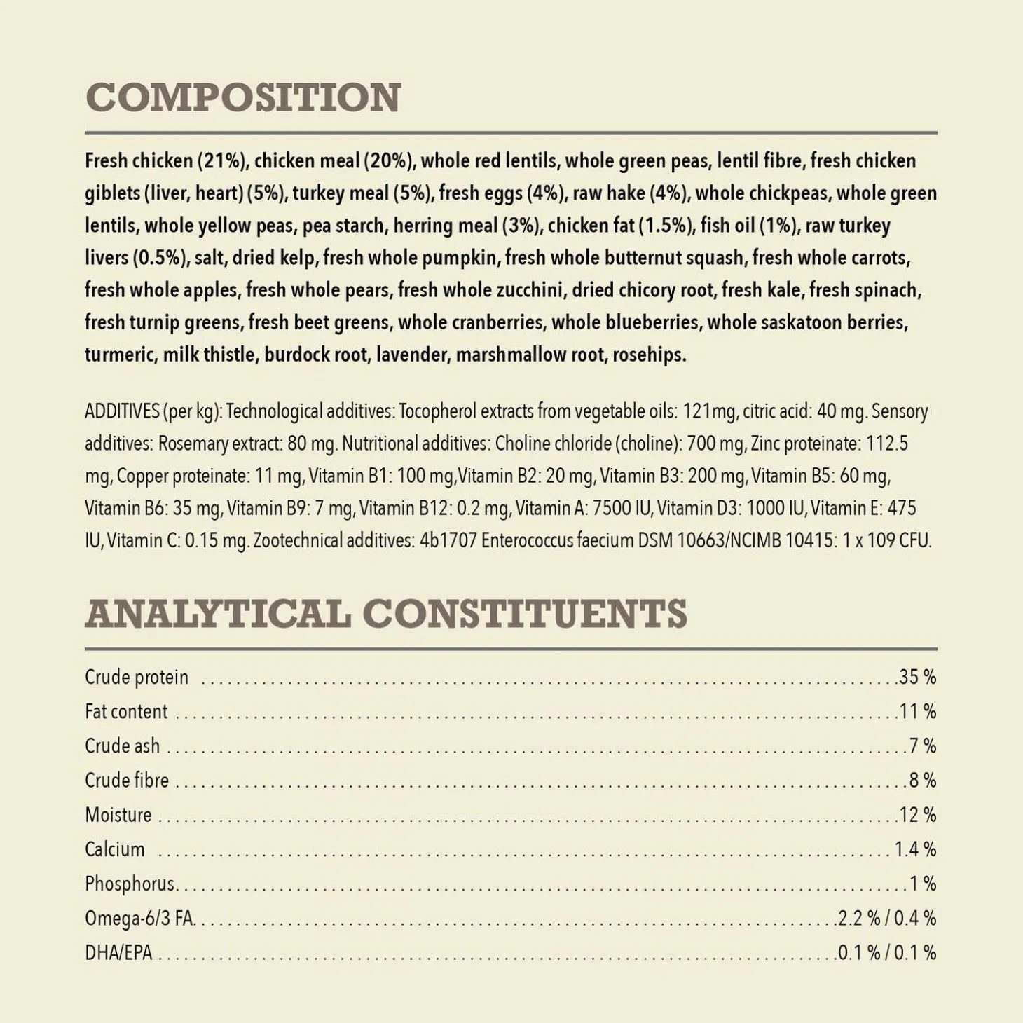 *The free-run chickens and turkeys are not housed in cages and are able to move in a barn without outdoor access. **Approximate and derived from the unprocessed state of the ingredients. ***ACANA also adds essential vitamins and minerals, natural preservatives and probiotics. ****Produced in a facility that also processes grains. The included fresh ingredients use refrigeration as the sole method of preservation and our included raw ingredients are frozen at their peak freshness.